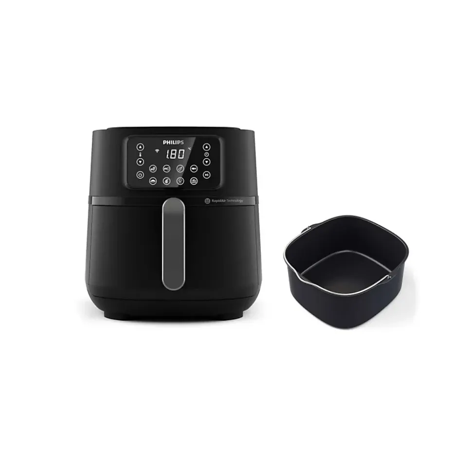 Friteuse sans huile 1.4kg 2000w noir Philips – Friteuse sans huile série 5000 HD9285 93 de Philips.Votre compagnon de cuisine connecté pour des repas sains :Associez-le à l’application NutriU pour trouver l’inspiration, tous les joursL’Airfryer Philips XXL connectée série 5000 est votre compagnon de cuisine quotidien pour préparer des repas savoureux, équilibrés et en toute tranquillité pour toute la famille, n’importe quand.Compagnon de cuisine connecté :Notre application NutriU intuitive se connecte en toute simplicité à votre Airfryer pour devenir votre compagnon de cuisine quotidien. En plus de la friture saine, découvrez et partagez de nouvelles recettes passionnantes.Vous pouvez même surveiller votre cuisson à distance et vous libérer du temps pour les choses que vous aimez.Fonctions de préparation 16 en 1 :La nouvelle Airfryer Philips XXL connectée série 5000 offre 16 fonctions de préparation différentes : frire, cuire, griller, rôtir, déshydrater, toaster, décongeler, réchauffer, fermenter et bien plus encore.Facile à utiliser et à nettoyer :Toutes les pièces amovibles passent au lavevaisselle. Le panier QuickClean de l’Airfryer est doté d’un revêtement anti-adhésif facilitant le nettoyage. La friture à l’air vous épargne les traditionnelles odeurs dans la maison. – Type de produit : FriteuseType de friteuse : Sans huileTechnologie de friture avec peu de graisse : Rapid AirCapacité de frites (en kg) : 1.4Capacité : 7.2 lForme : Friteuse CarréeBac à huile amovible : OuiMinuteur : ElectroniqueMatière du corps de l’appareil : PlastiqueLongueur du cordon : 0,8 mAlimentation : 2000 WTension : 220-240 voltFréquence : 50 HzTempérature (min) 40 °CTempérature (max) 200 °CNombre de personnes : 6 personne(s)Durée de la minuterie : 60 minRevêtement : AntiadhésifNombre de programmes : 16Frire : OuiRôtir :