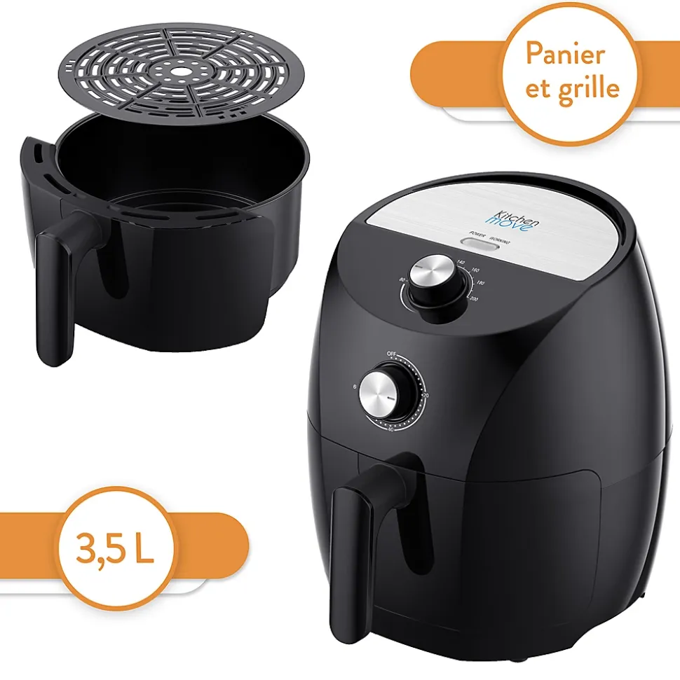 Friteuse sans huile 3.5l 1400w Kitchen Move – Le principe de fonctionnement de la friteuse à air chaud est simple : les aliments sont cuits à 360 ° grâce à la technologie de circulation de l’air chaud.Cet appareil peut cuire, frire, griller rôtir, sécher, réchauffer… sans utiliser d’huile.Cette cuisson préserve le goût, la fraîcheur et les valeurs nutritionnelles des aliments.Un bouton de séparation permet de sortir le panier facilement.Le bac et le panier sont tous les 2 antiadhésifs , ce qui rend le nettoyage plus pratique et aussi lavable au lave-vaisselle.La friteuse à air chaud de grande taille offre plus d’espace que d’autres sur le marché et convient à plus d?aliments.La capacité de 3.5 L répond également aux besoins d’une famille de 3 personnes.Avec une puissance extrêmement puissante de 1400 W, l’Airfryer peut chauffer rapidement, ce qui réduit le temps de cuisson et économise de l’énergie.Arrêt automatique et fonction de mémoire après la cuisson de la friteuse à air chaud, le programme est automatiquement fermé pour économiser de l’énergie.Vous pouvez tirer le panier pour secouer des aliments ou ajouter des épices et du sel sans interrompre la durée ou la température préréglée.Lorsque vous remettez le panier, la friteuse à air chaud est à nouveau en fonction.De plus, une protection contre la surchauffe et un arrêt automatique garantissent un fonctionnement en toute sécurité.L’air est chauffé à la température idéale et circule à grande vitesse dans la chambre de cuisson afin que les aliments soient cuits uniformément, en les laissant croustillants et secs à l’extérieur mais doux et tendre à l’intérieur.Sa grande puissance permet de le chauffer instantanément et rapidement, (1,5 fois plus rapide qu’un four) .Pas de préchauffage nécessaire. Savourez d’excellentes fritures croustillantes, avec une quantité minime de matières grasses. – Friteuse sans huilePuissance : 1400