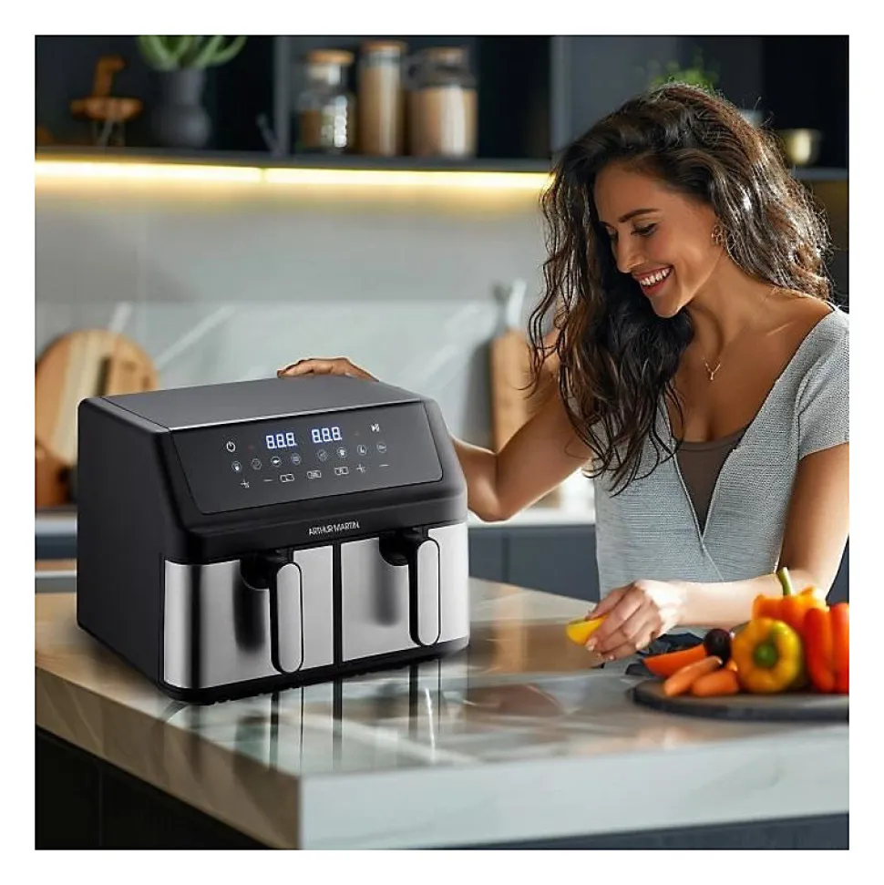 AMPF9 Air Fryer Double ARTHUR MARTIN – Friteuse sans huile – Puissance : 2000W – Capacité : 2x 4.5L soit total 9L – Minuterie : 60min – contrôle de température 80° a 200° – Pied antidérapant – Multifonction : Rôtir – réchauffer – Déshydrater – Cuire – Décongeler – Affichage LED