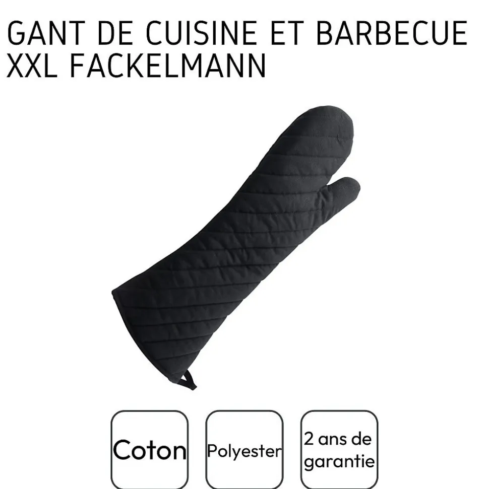 - DESCRIPTION : Fackelmann vous propose ce gant XXL de cuisine ou de barbecue. Ce gant vous protège de la chaleur jusqu’à 250°C pendant une durée d’environ 15 secondes