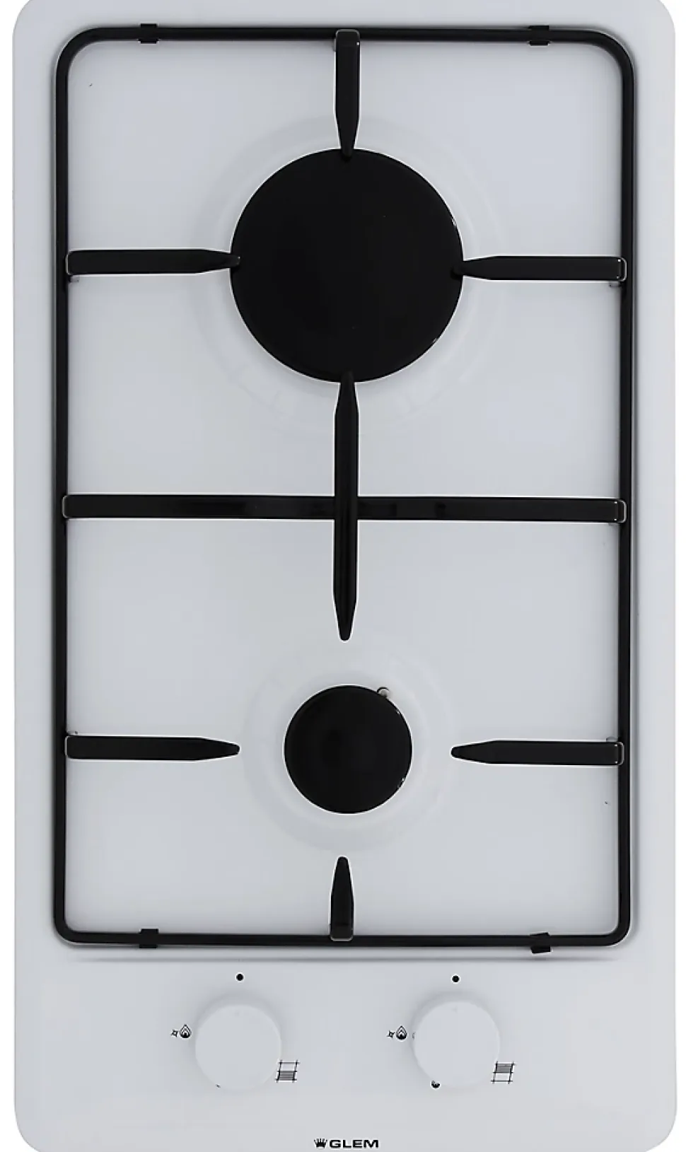 Plaque gaz GLEM GT32WH 2 brûleurs dont un rapide 3 kW, allumage intégré aux manettes, sécurité gaz par thermocouple, grille émaillée, commandes frontales, joint d’étanchéité fourni, finition blanc, compacte et puissante.