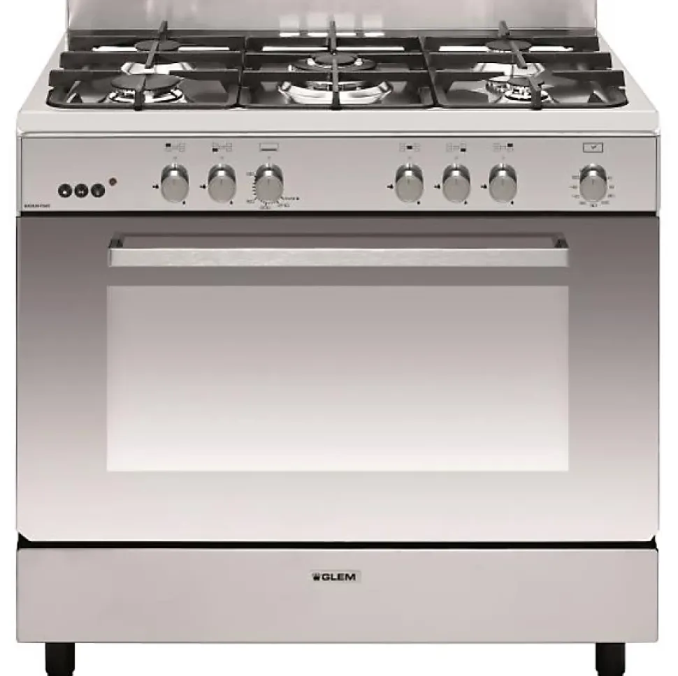 Cuisinière e-Cooker 90 x 60 cm inox Glem GE960CMIX2 avec 5 foyers gaz, dont un triple couronne 3,8 kW, four gaz catalyse de 109 L avec panneaux autonettoyants, gril électrique 2 kW, tournebroche, allumage électronique « bouton », sécurité gaz thermocouples, ventilateur tangentiel aspiré, coffre chauffe-plat, finition inox robuste. Idéale pour les cuisiniers exigeants cherchant performance et durabilité.