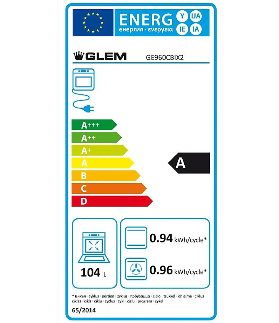 Description piano de cuisson mixte inox GLEM GE960CBIX2 :Piano de cuisson e-COOKER – Four électrique – 5 modes de cuisson dont Maxi Gril pulsé et Chaleur brassé – Minuteur sonore 60 minutes – Eclairage – Gradins fils – Panneaux catalytiques autonettoyants – Contre-porte plein verre avec verre démontable – Porte 2 vitres – Ventilateur tangentiel aspiré : l’air chaud du four est rejeté sur l’arrière, pas de souffle d’air en façade – Allumage de la table électronique – 5 brûleurs dont 1 triple couronne 3,8 kW – Sécurité gaz par thermocouple – Grilles émaillées mates – Départ de crédence – Coffre de rangement chauffe-plat – Homologué pour être encastré entre deux meubles de cuisine, selon la norme UNI EN 30-1-1 classe 2 – Finition inox.Code EAN : 8054383965069Caractéristiques piano de cuisson mixte inox GLEM GE960CBIX2 :Volume du four : 104 LEnergie four : électriqueType de cuisson : MultifonctionChaleur tournante : nonNettoyage four : CatalyseProgrammateur : sans (Minuterie simple)Préconisation température : nonOuverture porte : abattantePorte froide : nonEclairage intérieur : ouiTournebroche : sansEquipement : 1 grille + 1 lèchefriteTable de cuisson : 5 feux gazFoyer(s) gauche : AV -/3 _ AR -/1,75 cm/kWFoyer(s) droit : AV -/1 _ AR -/1,75 cm/kWFoyer(s) central : Triple couronne 3,8 kW cm/kWAllumage table : électroniqueSécurité gaz : par thermocoupleInjecteurs : Equipé pour le gaz naturel – Livrée avec injecteurs butane/propaneGrilles : émailléesLabels piano de cuisson mixte inox GLEM GE960CBIX2 :Label énergie. : ALe + produit : Finition inoxCordon électrique : fourni (120 cm) sans priseColoris : inoxDimensions (LxHxP) : 90 x 85/90 x 60 cmPoids net : 64 KgLieu de fabrication : Italie