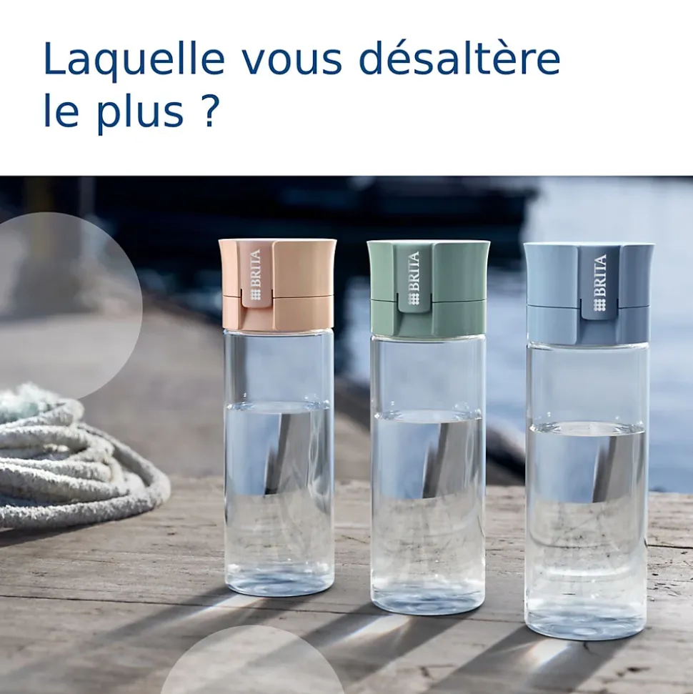La gourde filtrante vital Brita est idéale pour tous tes déplacements. Tu apprécieras le goût d’une eau du robinet plus pure* au goût agréable où que tu sois. Finies les bouteilles plastiques à usage unique ! Petit mais très performant, son filtre au charbon actif réduit efficacement le chlore et les substances pouvant altérer le goût et l’odeur de l’eau du robinet, les particules fines ≥ 15 µm, certains pesticides, herbicides et hormones si présents dans l’eau du robinet. Il préserve également les minéraux comme le calcium et le magnésium. 2 filtres à eau sont inclus avec la gourde filtrante vital Brita. La gourde filtrante Vital Brita, d’une contenance de 0,6 l, est dotée d’un couvercle et d’un embout rabattables d’une seule main pour davantage de praticité. Sa conception étanche protège contre les fuites, la saleté et la poussière lors des déplacements. Emporte-la partout avec toi pour rester hydraté tout au long de la journée. Pratique, tu pourras la remplir avec de l’eau potable facilement, partout où tu vas. Elle est également compatible au lave-vaisselle jusqu’à 55°c (à l’exception du filtre à eau microdisc). Sois acteur du changement. Parce que chaque bouteille plastique à usage unique évitée compte. Avec Brita, tu contribues activement à réduire le nombre de bouteilles plastiques à usage unique qui finissent à la poubelle. Moins de bouteilles plastiques, plus d’économies ! Brita, expert de la filtration depuis 1966. Qualité et design allemands.
