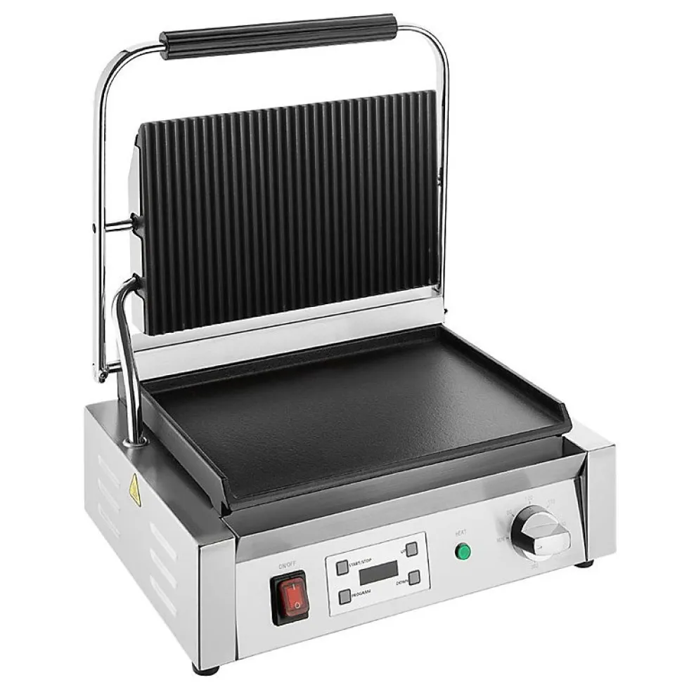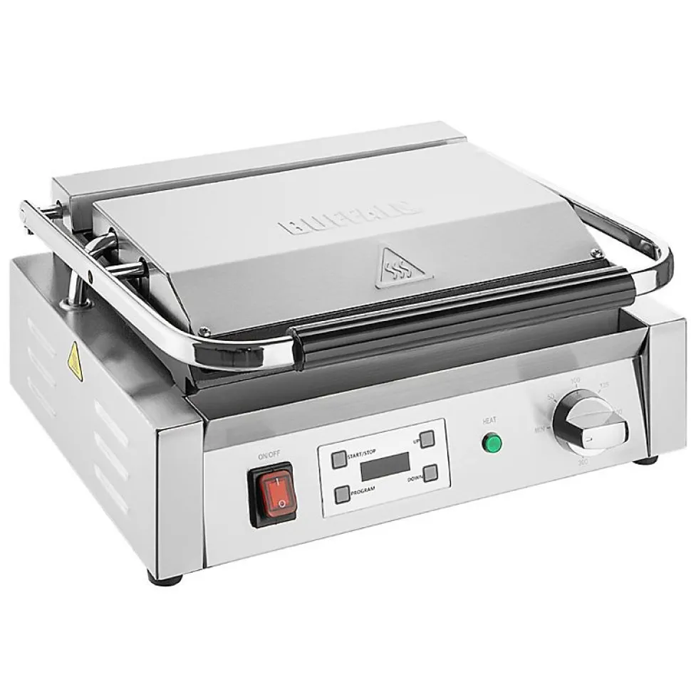 Donnez de l’énergie à votre cuisine avec les grils de contact extra-larges Buffalo. Conçus pour être utilisés dans des cuisines au rythme soutenu, ces grils offrent une zone de cuisson spacieuse et des commandes de chaleur réglables, garantissant que de grandes quantités d’aliments puissent être grillées avec précision. Les matériaux résistants offrent une excellente durabilité. Dimensions: 200(H) x 430(L) x 310(P) mmMatériel: InoxAlimentation: 220-240VPoids: 19,3 kgPrise: OuiMinuterie numérique avec 4 réglages de programmes pour une cuisson cohérentePlaques de gril en fonte émaillée lourde et durablePlateau de récupération de graisse amovible – facile à nettoyer sans déplacer le grilPlaque supérieure équilibrée – positionner la plaque au-dessus des aliments sans effortPlage de température 50-300°CLa fonte émaillée est facile à nettoyer et à entretenir