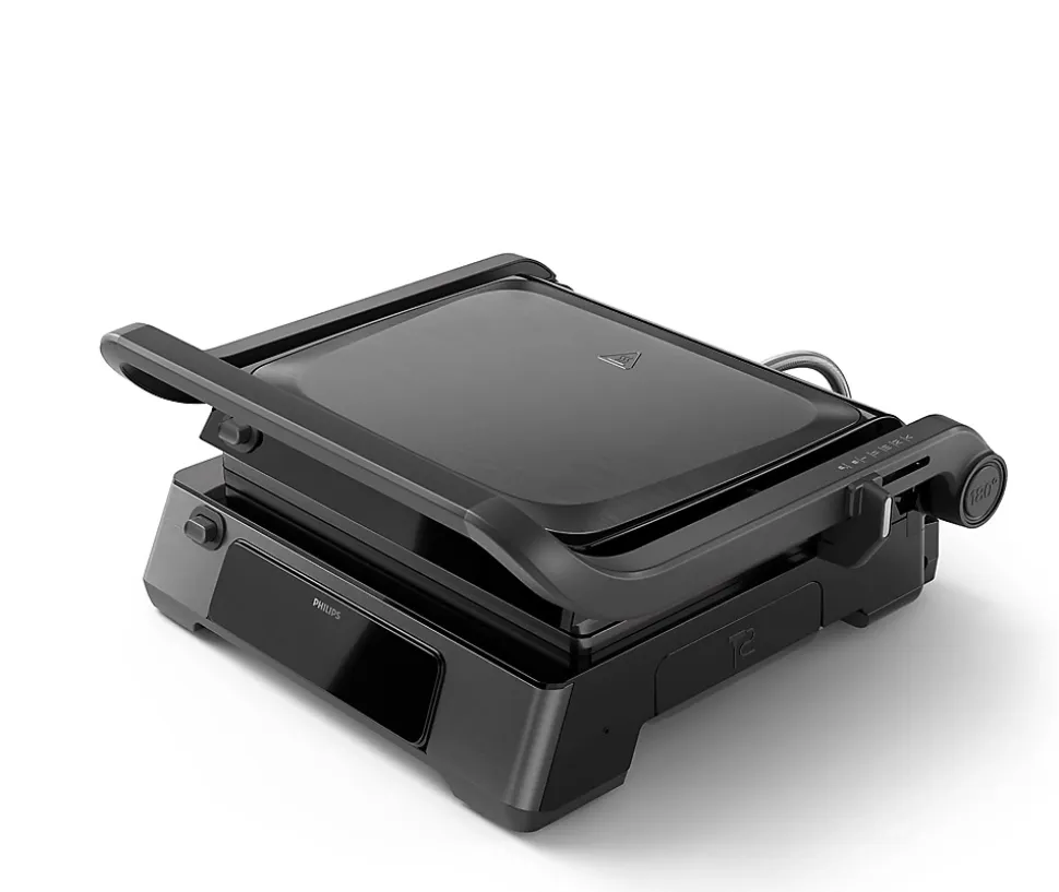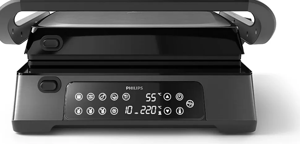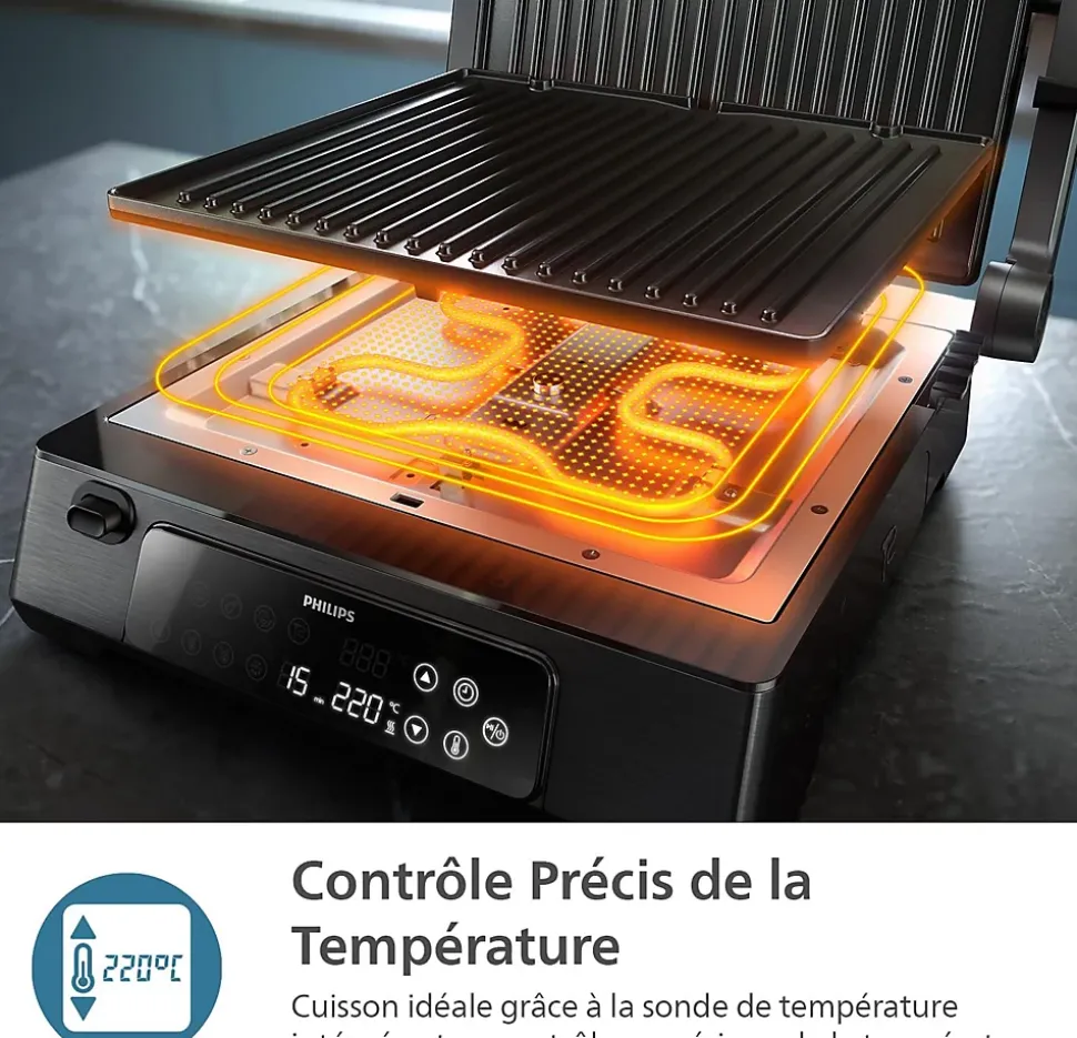 Profitez d’une cuisson maîtrisée grâce à la sonde de température intégrée qui mesure précisément la température interne de vos aliments pour un résultat parfait selon votre préférence, saignant, à point ou bien cuit. Ses 8 fonctions préréglées simplifient la préparation et garantissent des résultats constants d’une simple pression sur un bouton. Sa puissance de 2000 W assure une montée en température rapide et homogène, idéale pour saisir viandes, poissons et légumes. La grande surface de cuisson permet de préparer plusieurs portions simultanément, parfaite pour les repas en famille. Le contrôle numérique de la température offre un réglage précis pour adapter la cuisson à chaque recette. Le gril s’ouvre à 180° pour se transformer en gril de table et cuire des deux côtés en même temps. Les plaques antiadhésives et le bac récupérateur amovible facilitent le nettoyage pour un entretien rapide et pratique au quotidien.