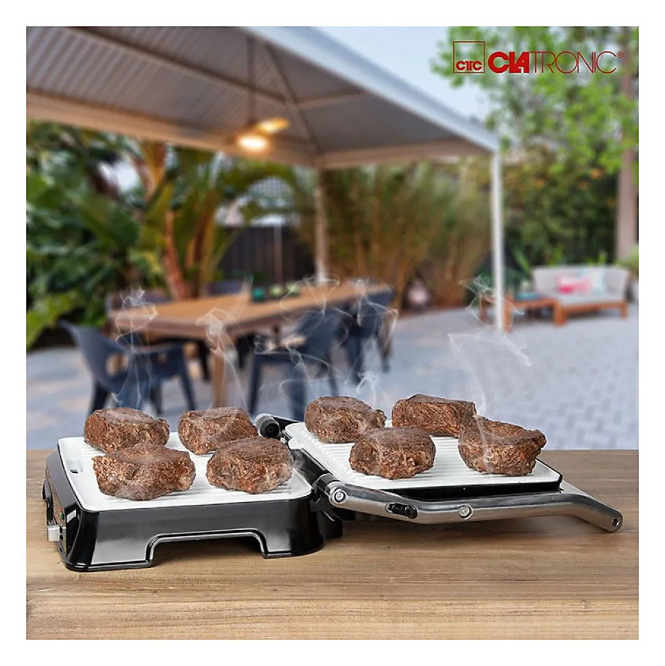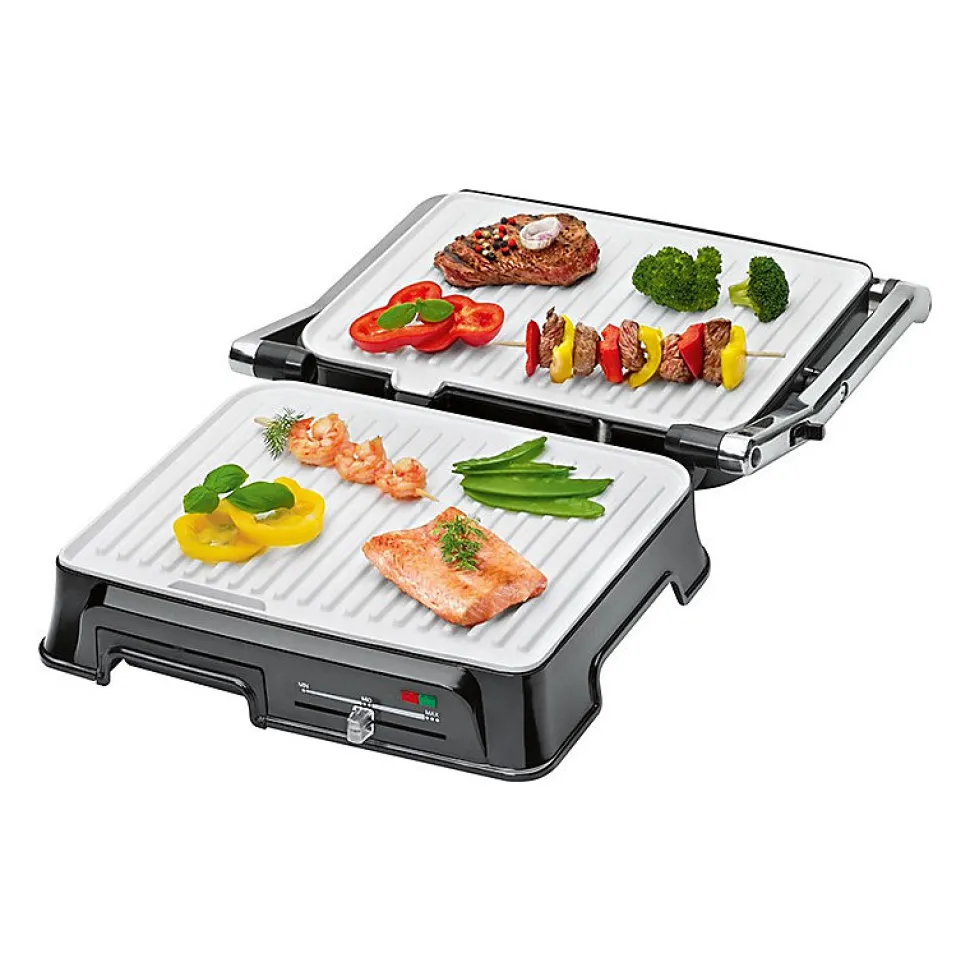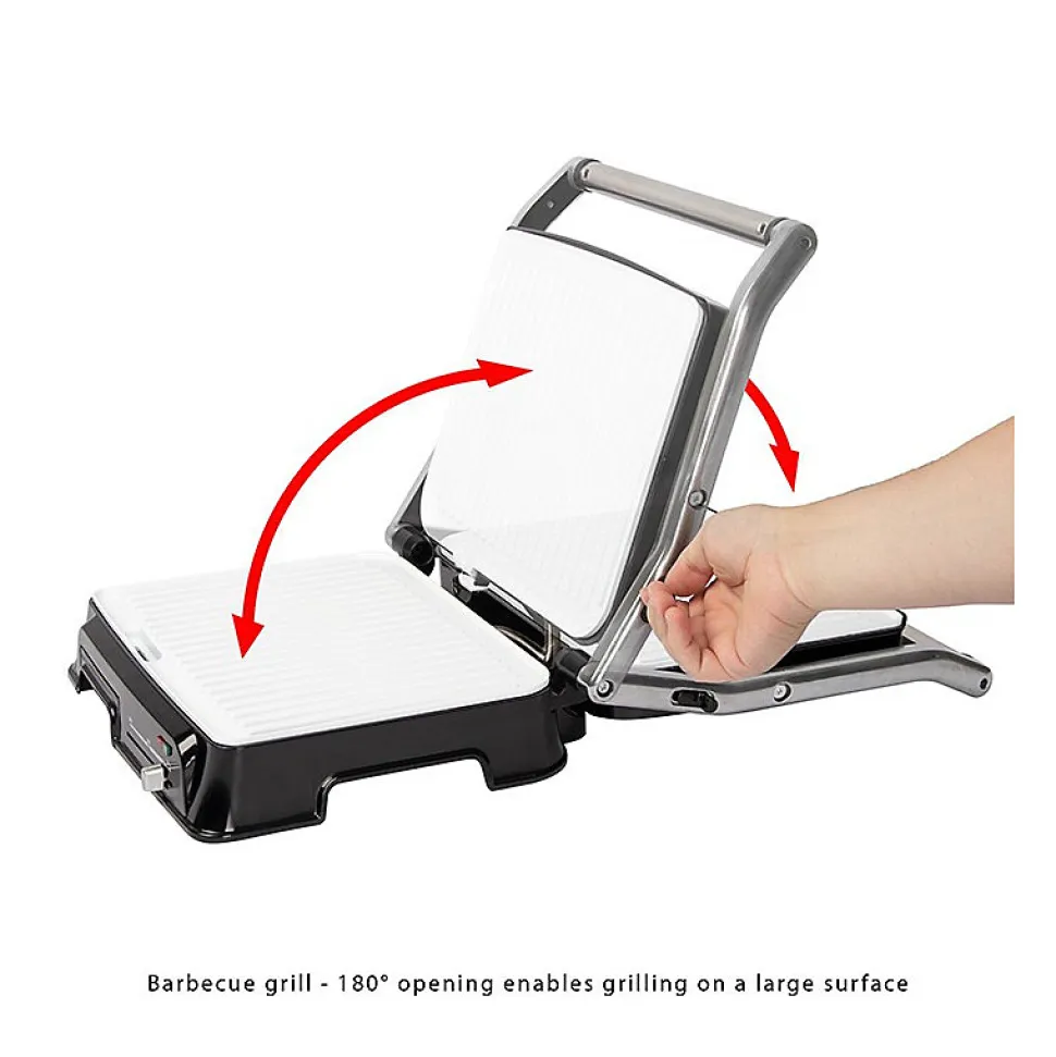 Grille de contact pour une grillade double face, sans graisseGrille de barbecue – l’ouverture à 180° permet de griller sur une grande surfaceCanal d’évacuation des graisses et bac de récupération (bac amovible pour un nettoyage facile)nettoyage facile)2000 wattsBoîtier en acier inoxydableThermostat réglable en continuTemps de cuisson courtsPlaques de gril résistantes aux rayures, à revêtement céramique avec desrainures très profondes pour un grillage puissant et un bon écoulement des graisses.Grande poignée isolée de la chaleur2 témoins lumineux pour l’alimentation et le chauffageAffichage de la température « prêt ».Grandes surfaces de gril : 2x 29,5 x 23,5 cm environRangement du cordonUtilisation polyvalente, par exemple pour les panini, les steaks, le poisson ou les légumes.220-240 V, 50/60 Hz, 2000 W