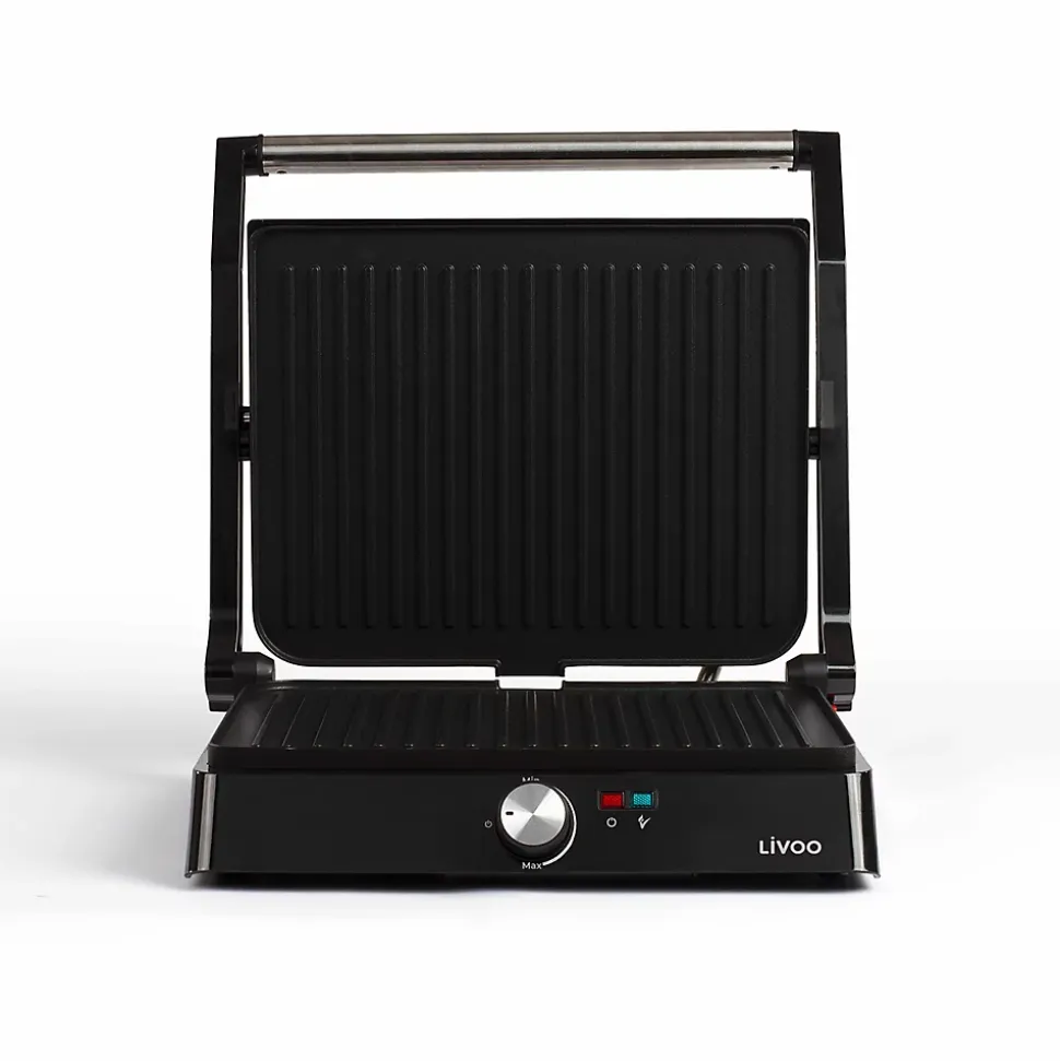 Grill Viande et Panini LIVOO DOC223 2200 W — 2 plaques rainurées antiadhésives, surface 29 x 23 cm (667 cm²), ouverture 180° pour fonction plancha, thermostat réglable jusqu’à 230 °C, récupérateur de graisse amovible, boîtier acier inoxydable et bakélite. Garantie 2 ans.