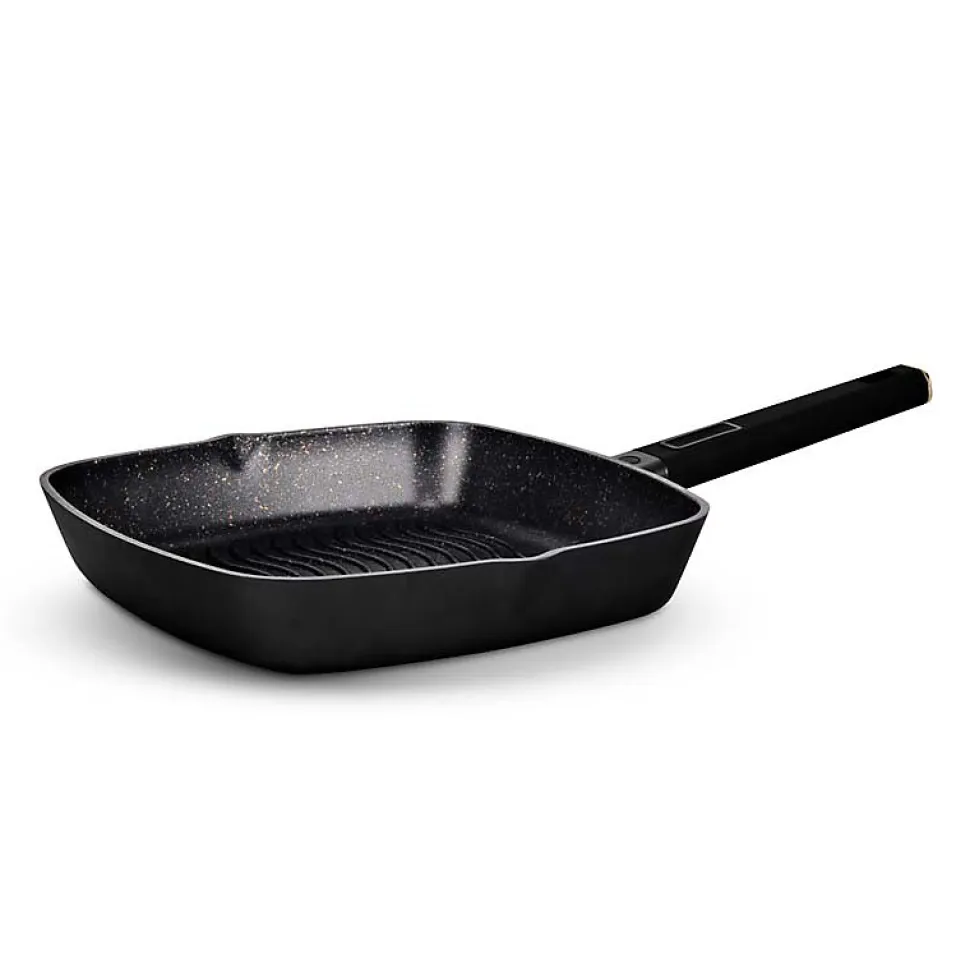 Le grill en fonte d’aluminium de 28 cm de la gamme BRASS de KitchenCook s’intégrera parfaitement à votre cuisine et à votre quotidien.Son matériau en fonte d’aluminium apporte solidité, longévité, et une bonne résistance aux rayures.Le revêtement intérieur est anti adhésif en effet pierre et le revêtement extérieur est très résistant.De plus le grill BRASS_GRIL28TFI dispose d’une poignée ergonomique en bakélite pour un toucher doux.Enfin, ce grill est compatible avec tous les feux dont l’induction.Les caractéristiques du grill Kitchencook : – Epaisseur du corps : 1.7 mm – Epaisseur du fond : 4.5 mm – Surface : 28 x 28 cm – Hauteur : 5.5 cm – Contenance : 3.13 LConseils d’utilisation : ne pas utiliser à plus de 200°C, ne pas utiliser d’éponge abrasive ni d’ustensiles de cuisine pointus, aiguisés ou contondantsLa fabrication de la casserolerie Kitchencook est conforme aux normes en matière d’hygiène et de sécurité,