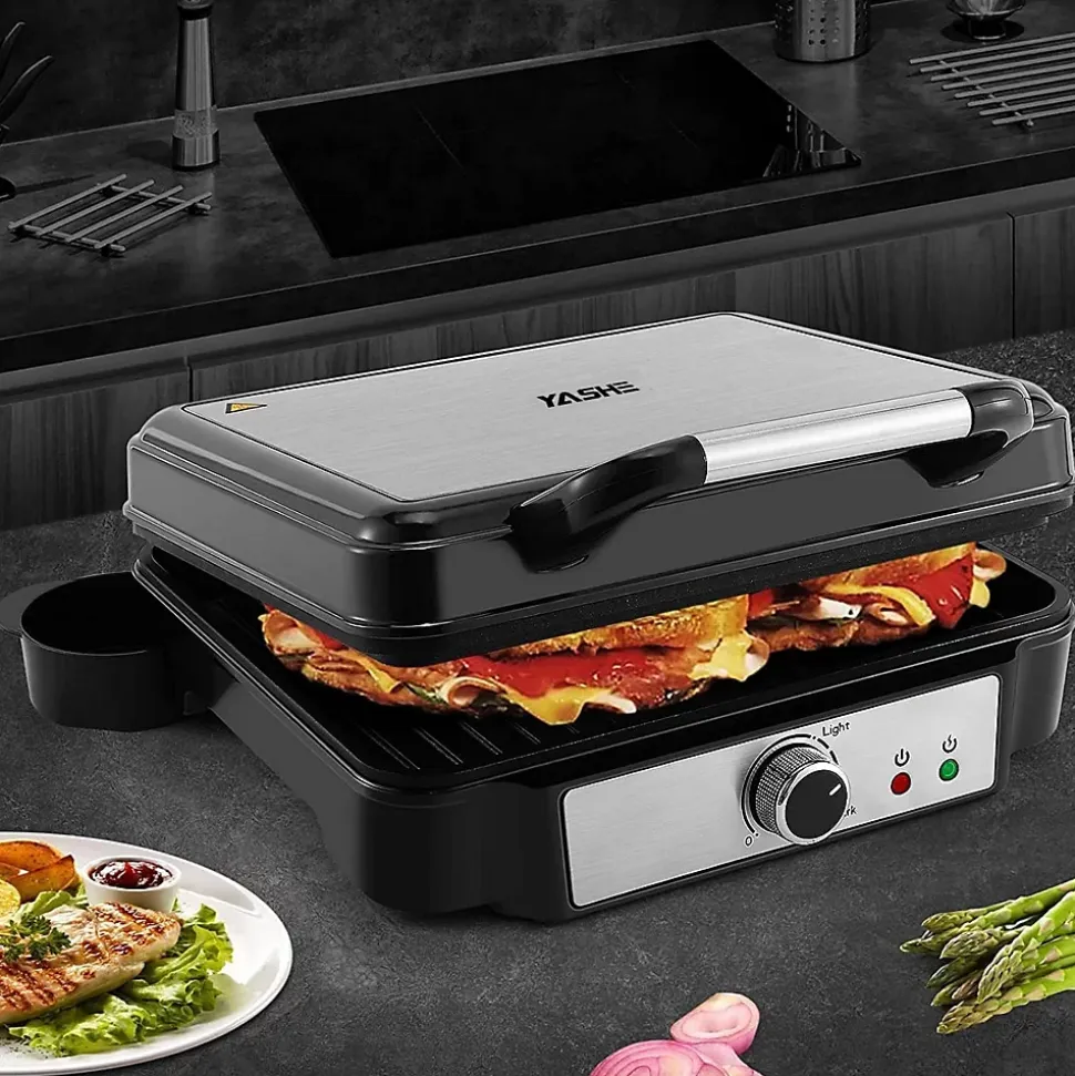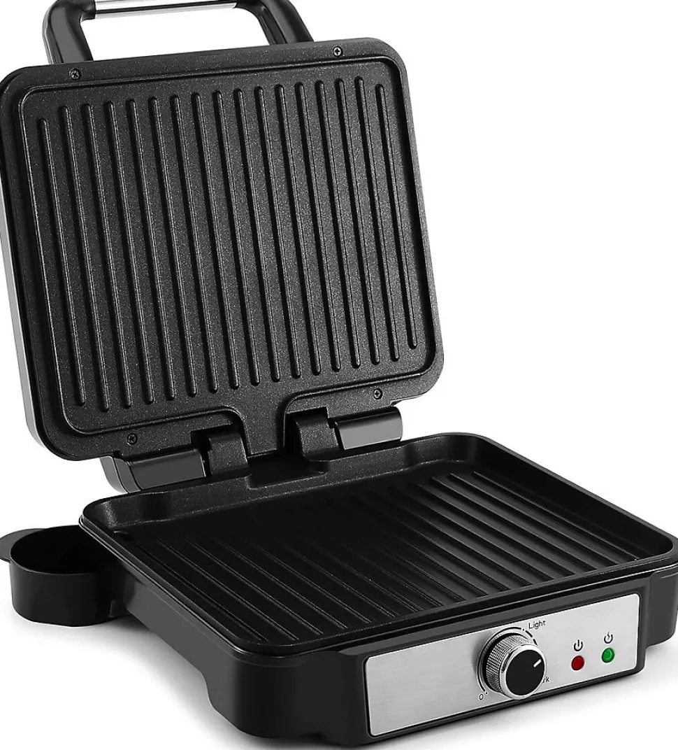 La presse à panini 3-en-1 combine puissance et polyvalence pour une cuisson rapide et homogène. Grâce à son ouverture à 180°, elle se transforme en grand grill électrique avec deux plaques antiadhésives de 28 x 23 cm, idéales pour steaks, paninis, sandwiches et légumes. Son thermostat réglable de 210 à 250 ℃ et ses voyants lumineux assurent un contrôle précis et simple. Le système de drainage intégré dirige l’excès de graisse vers le bac récupérateur pour une cuisson plus saine et un nettoyage facile. Compacte et sécurisée avec poignée froide et pieds antidérapants, elle est parfaite pour les petites cuisines.