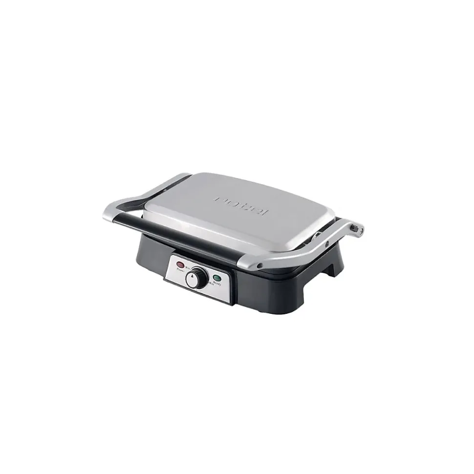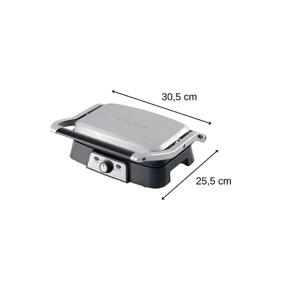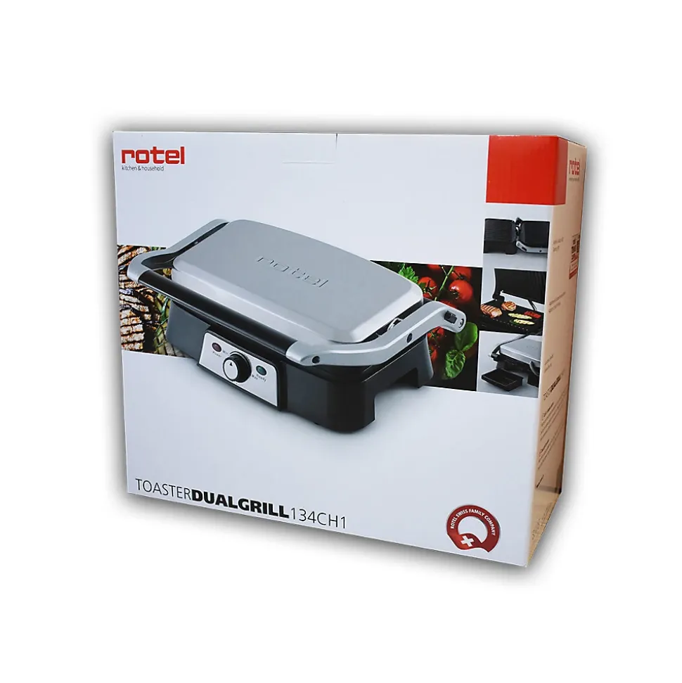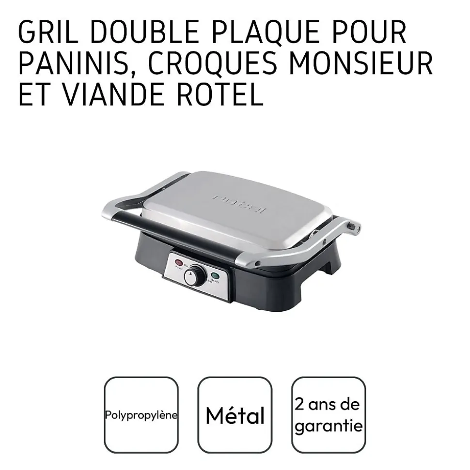 DESCRIPTION : Rotel vous propose ce gril à double plaque pour réaliser d’excellents tacos, dorer vos croque-monsieur, ou encore faire griller votre viandeLE PETIT + : L’appareil dispose d’un bac de récupération du jus et d’une rainure d’évacuation pour cuisiner sans salir le plan de travailCOMPOSITION : Métal, PlastiqueDIMENSIONS : 30,5×25,5x11cmENTRETIEN : Lavage avec une éponge humide et du savonRotel est une marque Suisse qui propose depuis plus de 70 ans des produits de petit électroménager performants, à usage domestique ou semi-professionnel. Que ce soit pour la cuisine ou le ménage, vous trouverez toujours les appareils qui répondent à vos besoins chez Rotel. De plus, avec leur design sobre et épuré, les appareils s’intègreront parfaitement chez vous. Rotel vous propose ce gril à double plaque.Le gril à double plaque Rotel dispose d’un revêtement antiadhésif et d’une rainure d’évacuation du jus ou des matières grasses. La plaque articulée de l’appareil permet de griller des aliments à épaisseur variable. Les plaques s’ouvrent à 180° et la poignée de la machine est thermo-isolante pour éviter les brûlures. Il y a un contrôle automatique de la température, et les témoins lumineux indiquent quand l’aliment est cuit.Il est fourni avec un bac de récupération du jus. Dimensions : 30.5 x 25,5 x 11 cm