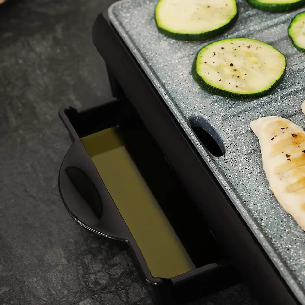 Le grill électrique Cecotec 1500 W assure une cuisson rapide et homogène grâce à sa répartition optimale de la chaleur et sa surface de 24,5 x 17,3 cm. Son revêtement en pierre RockStone garantit une antiadhérence maximale et un nettoyage facile, sans PTFE ni PFOA. Conçu pour une meilleure conservation de la chaleur et une cuisson double zone efficace, il offre des résultats savoureux à chaque utilisation. Les plaques disposent d’un bec verse-graisses et d’un bac récupérateur pour une cuisine plus propre et plus saine. La plaque supérieure flottante s’adapte automatiquement à l’épaisseur des aliments pour une cuisson uniforme.