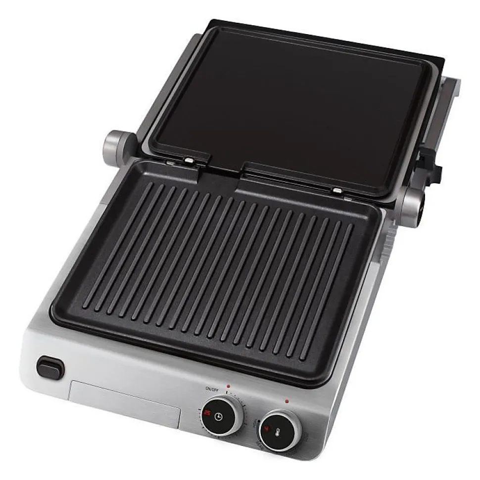 Découvrez le grill de contact SBG 5030BK, avec un design exclusif en verre et des plaques de grill antiadhésives de 3eme génération avec une spirale de chauffage intégrée. Il offre la possibilité de griller sans ajouter d’huile et dispose de deux types de plaques : une plaque supérieure lisse et une plaque inférieure nervurée. Il propose 3 positions de fonctionnement (fermé, ouvert à 90°, ouvert à 180°) et est équipé d’un bac a huile amovible, de plaques de grill lavables au lave-vaisselle, et d’un minuteur de 30 minutes. Sa poignée isolée thermiquement est également adaptée pour presser des sandwiches.