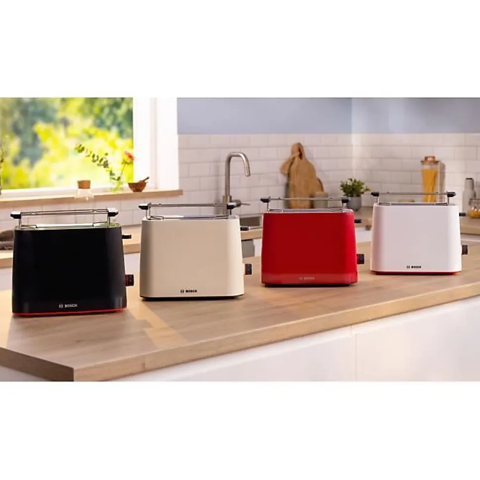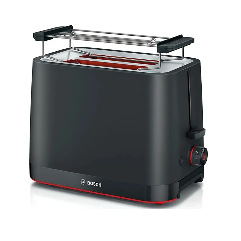 Grille-pain BOSCH TAT3M123, design compact noir avec fonction décongélation, réchauffage, thermostat variable, 2 tranches, puissance 950 W, système HighLift, bac à miettes amovible, cordon de 1 m.