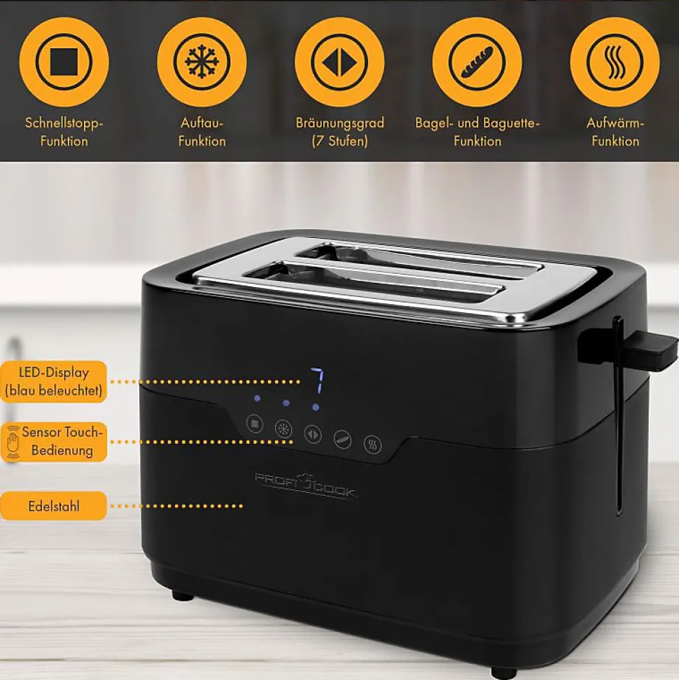 Grille-pain à 2 tranchesBoîtier en acier inoxydableFentes de grillage extra larges (40 mm)Fonctionnement par capteur tactileDispositif pour petits pains (amovible)Fonction décongélation/réchauffage/arrêt rapide/bagel et baguette (éclairage bleu)7 niveaux de brunissement réglablesFonction de centrage pour un brunissement uniformeArrêt automatique et manuelTiroir à miettesRangement du cordonSupport sûr grâce aux pieds caoutchoutés220-240 V, 50/60 Hz, 770-920 W