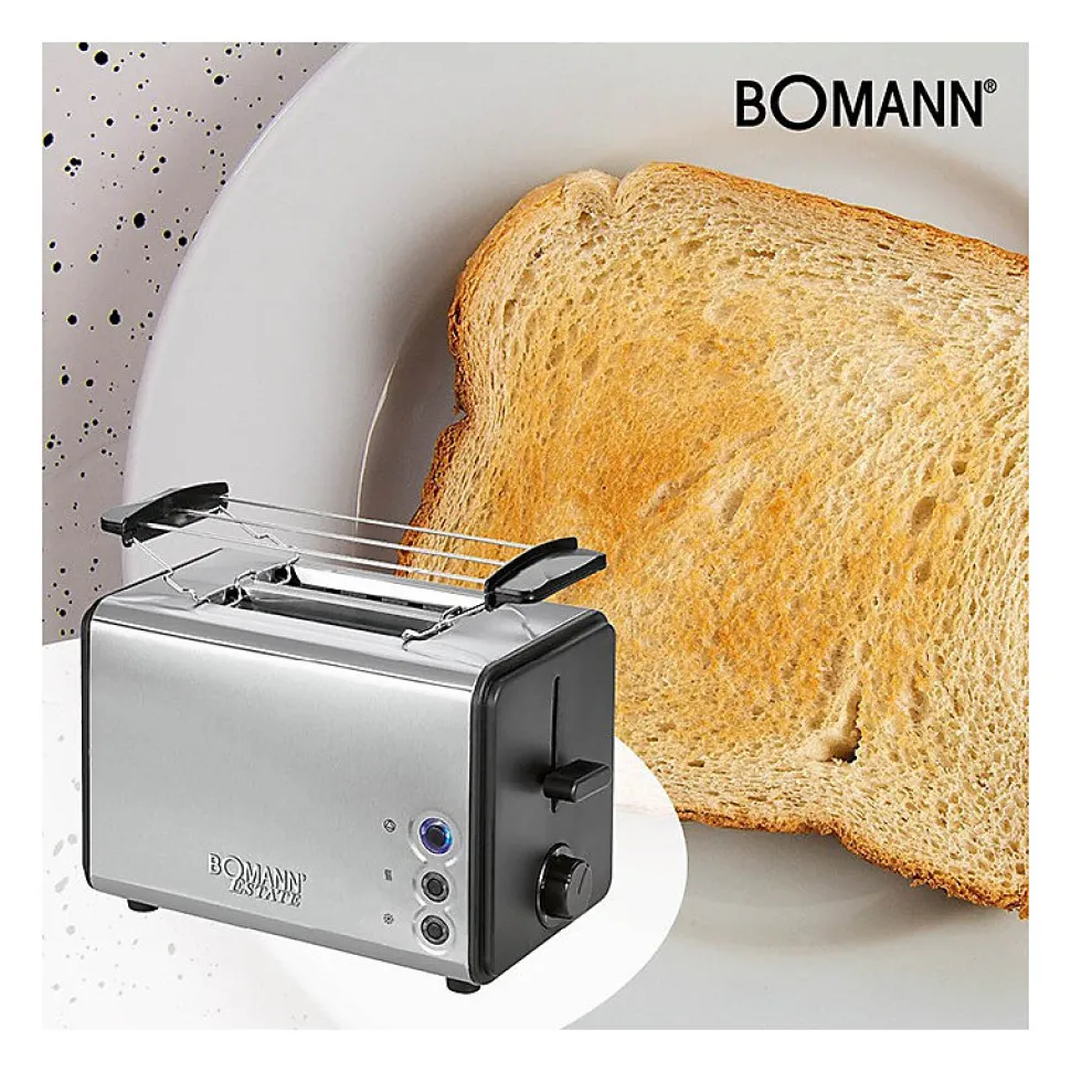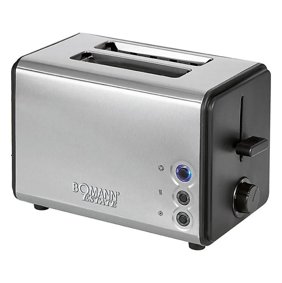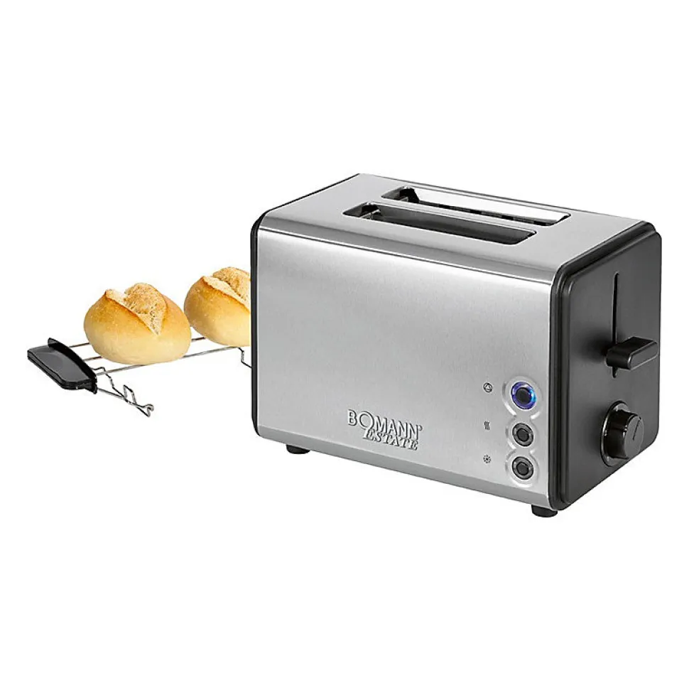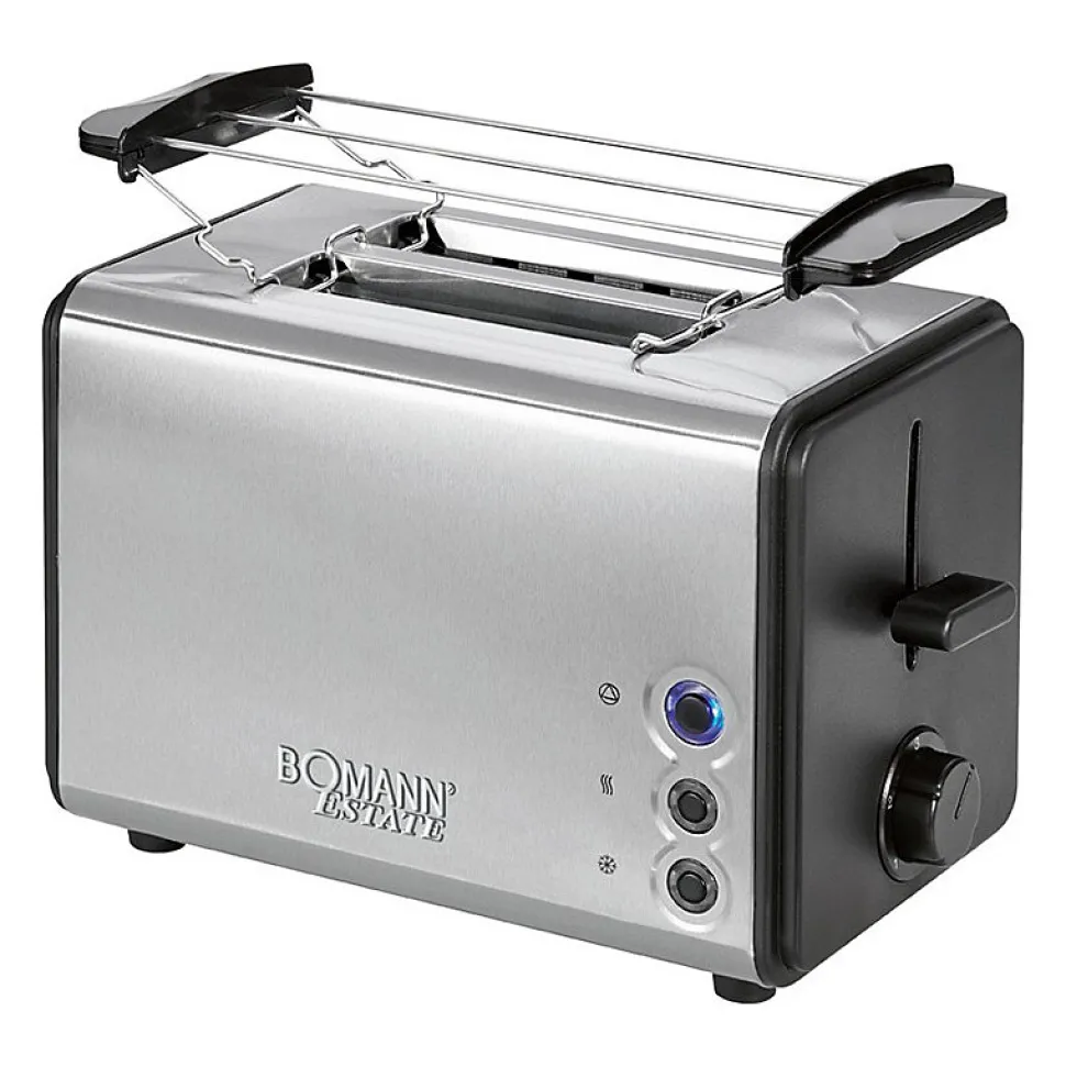 GRILLE-PAIN A 2 TRANCHESBoîtier en acier inoxydablePorte-pain (amovible)Décongélation, réchauffage, fonction d?arrêt rapide (illuminée en bleu)Thermostat réglable en continuFonction de centrageArrêt automatique/manuelTiroir à miettes, amoviblePrise de plomb électrique220-240 V, 50/60 Hz, 750-850 W