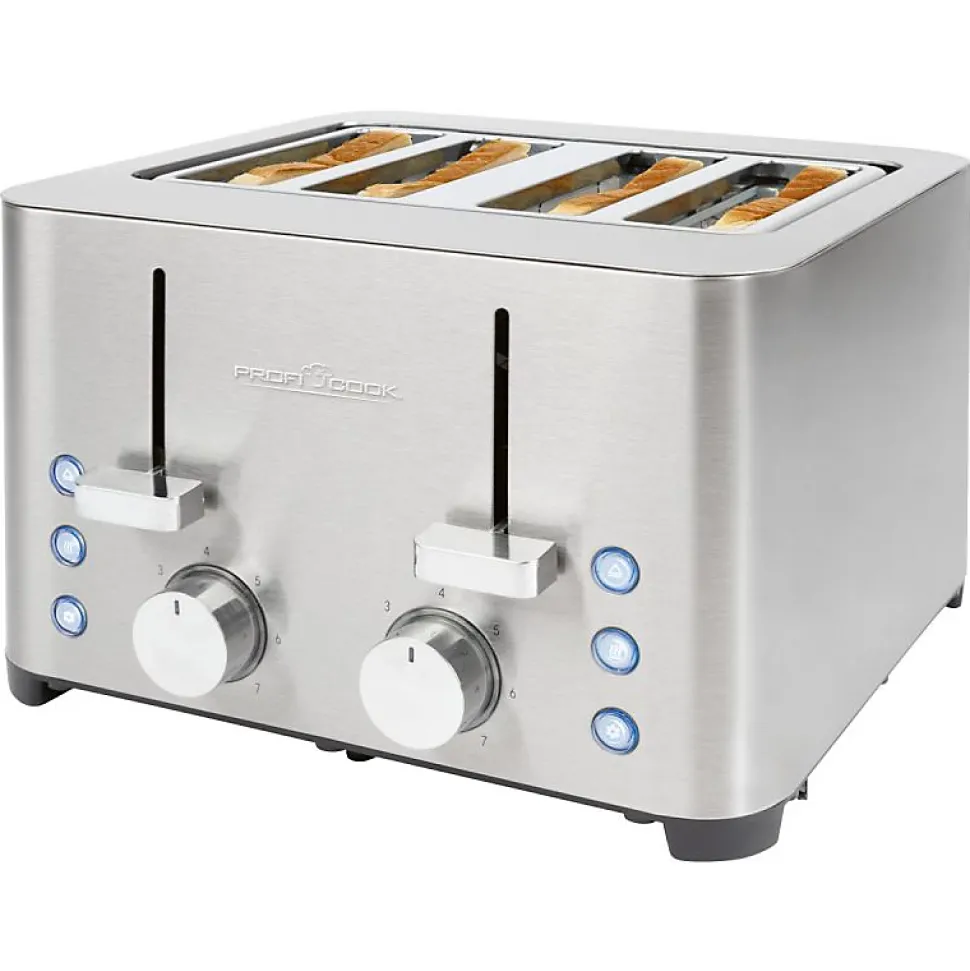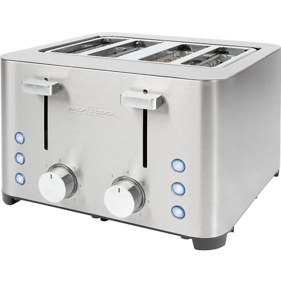 Grille-pain à 4 tranchesBoîtier en acier inoxydableFentes de grillage extra larges (40 mm) pour les bagels, les petits pains grillés, etc.Arrêt automatique et manuel2 régulateurs de grillage réglables en continu2x fonction de centrage pour un brunissement uniforme2x fonction de décongélation (éclairée)2x fonction de réchauffage (éclairée)2x fonction d’arrêt rapide (éclairée)2x support pour petits pains (amovible)2x tiroir à miettes (amovible)Rangement du cordonSupport sûr grâce aux pieds caoutchoutés220-240 V, 50/60 Hz, 1260-1500 W max.