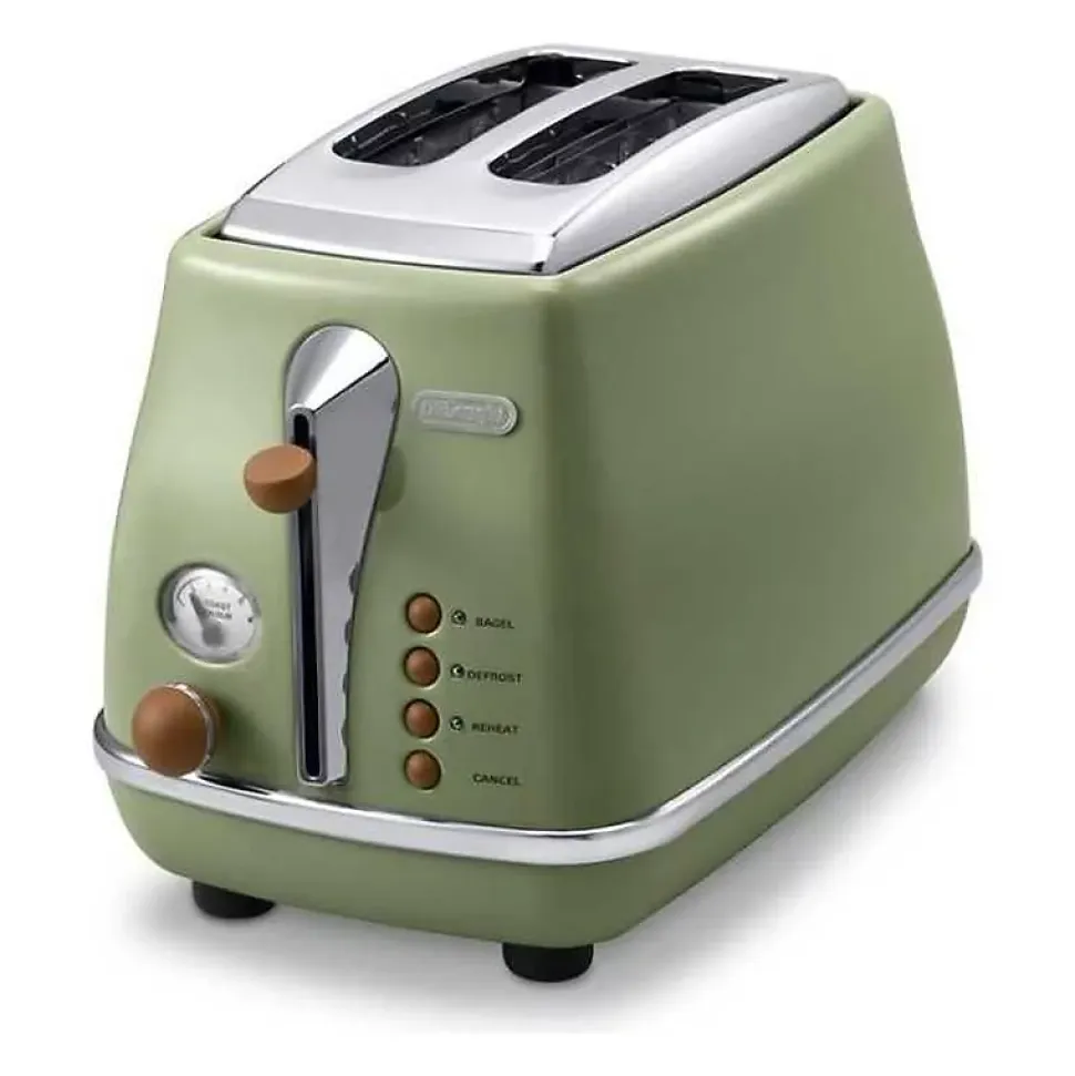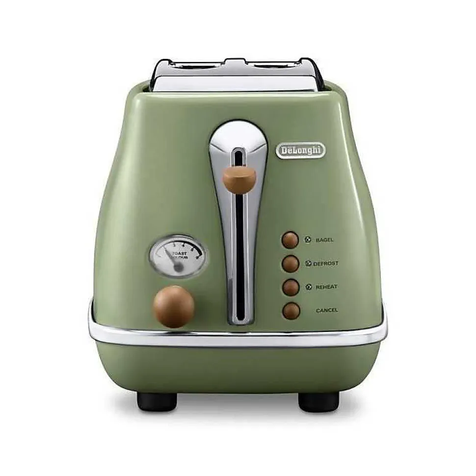 Grille-pain Delonghi Icona Vintage 900 W, 2 tranches avec 6 niveaux de brunissage, fonctions réchauffe, décongélation, bagel et annulation, tiroir à miettes amovible et position extra haute pour un usage pratique au quotidien.