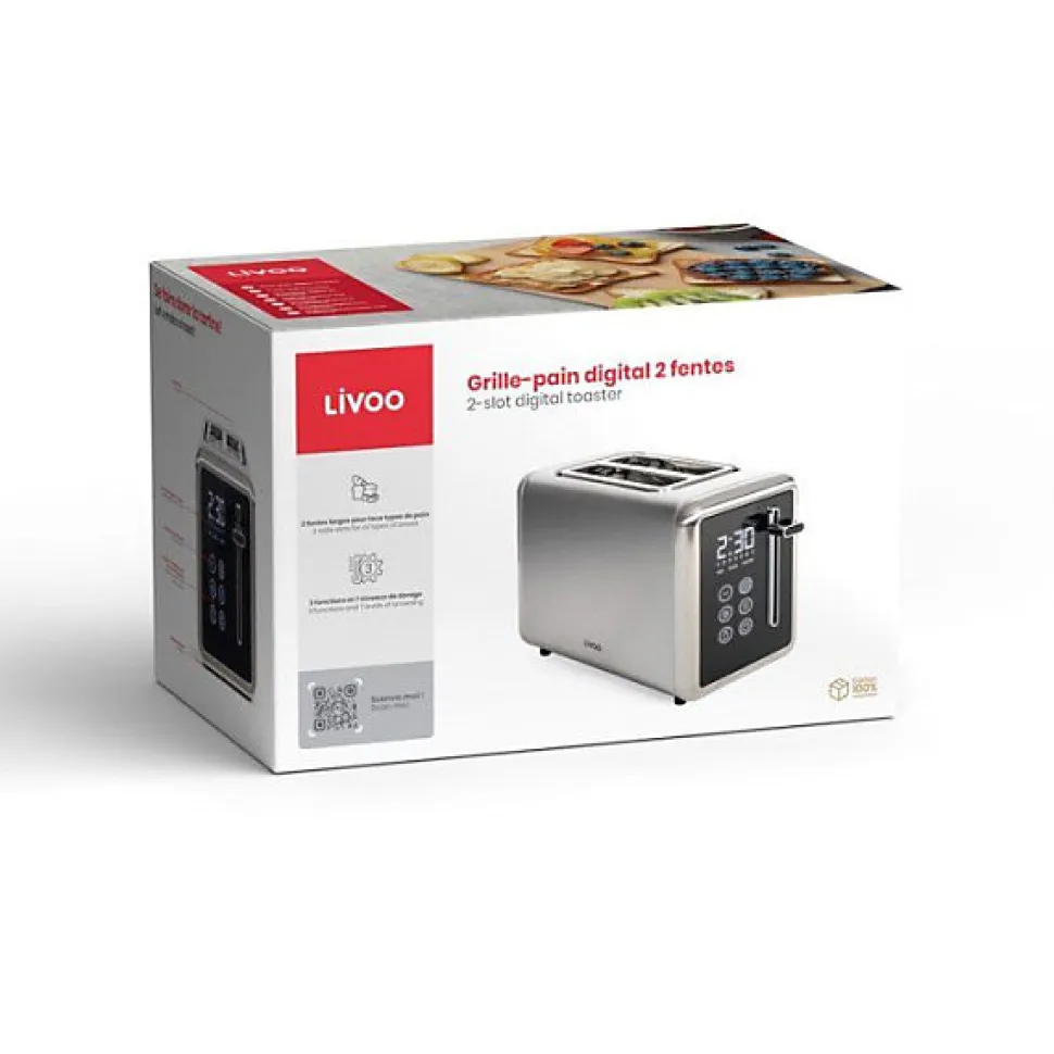 Grille-pain numérique 2 fentes LIVOO DOD205 en acier inox brossé, avec fentes larges de 3,5 cm adaptées au pain, bagels et gaufres. Puissance variable 720–850 W, 7 niveaux de brunissage, panneau tactile et afficheur numérique, fonctions décongélation, réchauffage et arrêt manuel, éjection automatique, tiroir ramasse-miettes amovible, levier relevable chromé, pieds antidérapants et design compact (28,5 x 15,6 x 18,9 cm). Garantie légale de conformité 2 ans.