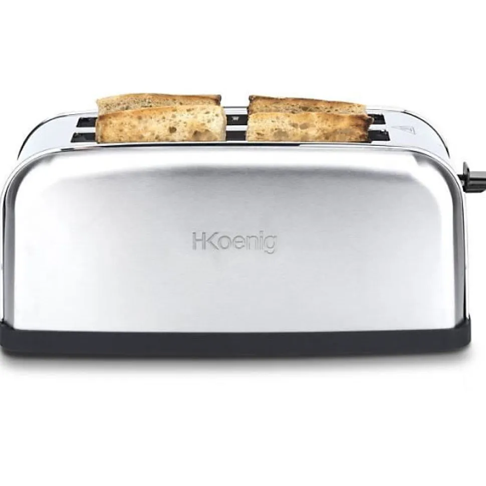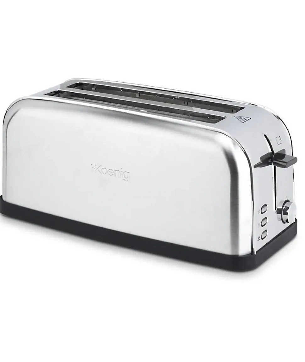 Le grille-pain H.KoeNIG TOAS28 est équipé de deux fentes pour toaster deux tranches de baguettes ou quatre tranches de pain de mie simultanément. Il possede différentes fonctions telles que la décongélation, le réchauffage et l’annulation. Le thermostat réglable sur 7 niveaux de brunissage vous permettra de déguster un pain grillé selon vos envies.