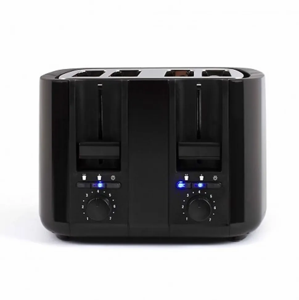 Un grille-pain maxi capacité :Ce grille-pain permet de faire griller rapidement de nombreuses tranches de pain puisque l’appareil dispose de 4 fentes. Sa couleur noire, sobre et élégante s’accordera dans n’importe quelle cuisine.Deux thermostats indépendants :Le modèle dispose de deux thermostats indépendants ce qui permet d’ajuster la température et de faire griller différentes sortes de pain en même temps.L’appareil permet de décongeler directement des tranches sorties du congélateur, de réchauffer du pain et d’arrêter manuellement l’appareil.Les 7 positions du thermostat permettent d’obtenir un pain légèrement ou bien doré selon vos préférences.Le tout sans miettes :Amovible, le tiroir ramasse-miettes est pratique et facile à nettoyer. Fini les miettes qui traînent sur le plan de travail de la cuisine.Avantages principaux :- Grille-pain 4 fentes- Puissance : 1500W- Fonctions arrêt manuel, réchauffage et décongélation- Thermostat réglable : 7 positions- Ejection automatique- Tiroir ramasse-miettes- Parois froides…