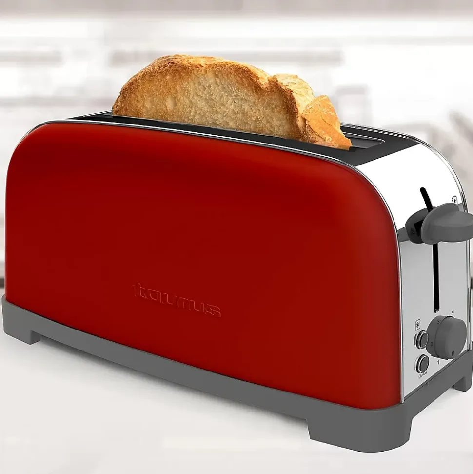 Grille-pains 1 fente 850w rouge Taurus – Ce grille-pains vintage Taurus VINTAGESINGLERED850W est doté de 2 fonctions : Décongeler et réchauffer + Fonction STOP. – Type de produit : Grille-pains.Puissance : 850 W.Matière : Acier inoxydable.1 fente extra longue à largeur variable.Capacité : 2 tranches courtes ou 1 longue.2 fonctions : Décongeler et réchauffer.Fonction STOP.Bouton avec éclairage LED.6 niveau de brunissement.Système d’auto-centrage du pain.Extraction facile du pain.Plateau ramasse-miettes.Range-cordon.Couleur : Rouge.Dimensions produit (LxHxP) : 36 x 18 x 12,5 cm.Poids net : 0,89 Kg.