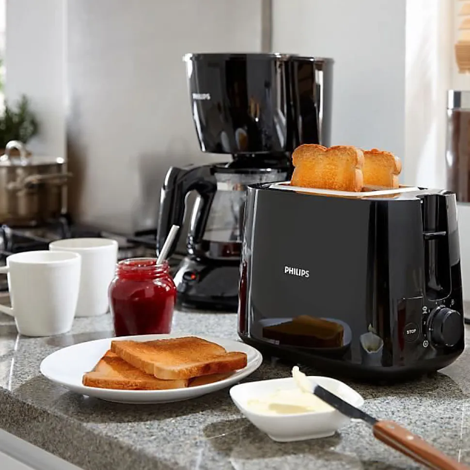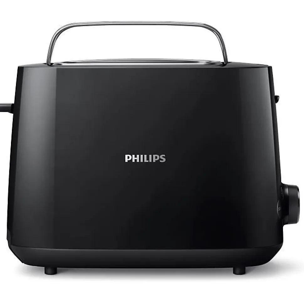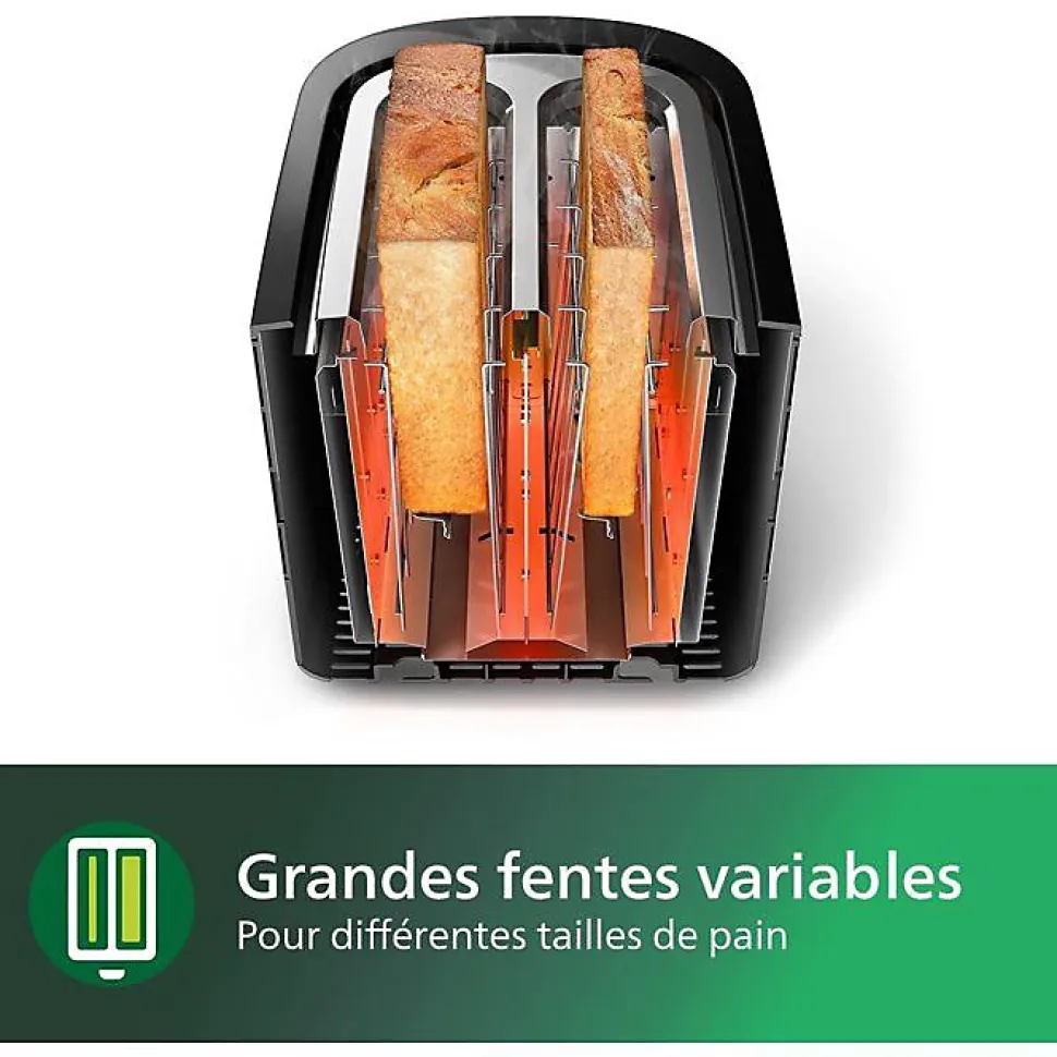 Grille-pains 2 fentes 830w noir Philips – Ce grille-pain compact Philips HD2581/90 offre 8 réglages et 2 grandes fentes à largeur variable, pour un dorage parfait, quel que soit le type de pain utilisé. Le réchauffe-viennoiseries intégré vous permet de réchauffer vos petits pains, pâtisseries et brioches facilement.8 niveaux de dorage, pour un pain grillé comme vous l’aimezLes 8 réglages vous permettent de griller différents types de pain sans risquer de les brûler. Sélectionnez le niveau de dorage de votre choix, pour du pain grillé comme vous l’aimez.2 grandes fentes à largeur variable pour différentes tailles de pain. Le système de centrage automatique du pain permet un dorage uniforme sur les deux faces.Accessoire réchauffe-viennoiseries intégré pour réchauffer petits pains, pâtisseries et brioches facilement.La fonction réchauffage réchauffe le pain grillé en quelques secondes, tandis que la fonction décongélation grille directement le pain congelé.Arrêtez à n’importe quel moment en appuyant sur le bouton arrêt.Facile à nettoyer grâce au ramasse-miettes amovible.Fonction surélevage pour un retrait facile des petites tranches de pain.L’arrêt automatique protège le produit contre les courts-circuits. – Puissance : 8300 W.Nombre de fentes : 2.Nombre de niveaux de dorage : 8.Mode d’emploi : 100% de papier recyclé.Couleur : Noir.Matériau du corps de l’appareil : Plastique.Fréquence : 50-60 Hz.Alimentation : 830 W.Tension : 220-240 volt.Fabriqué en : Chine.Dorage ajustable : Oui.Arrêt automatique : Oui.Bouton éjection : Oui.Parois froides : Oui.Fonction décongélation : Oui.Surélevage : Oui.Rangement du cordon intégré : Oui.Dimensions du produit (Lxlxh) : 27,5×15,6×18,8 cm.Poids : 1,1 Kg.