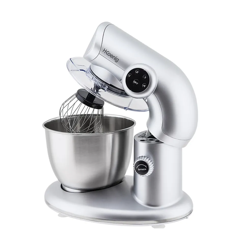 DESCRIPTION :Avec sa grande capacité de 5 litres soit 2 kg de pâte et sa puissance de 1000 watts, le robot pétrin KM80 vous permettra de réaliser vos préparations en toute simplicité.Efficace, l’appareil est doté de 4 vitesses pour s’adapter à tous vos besoins.Pratique et élégant, son design en inox avec sa tête inclinable facilite l’accès au bol mixeur. Le couvercle antiéclaboussures vous facilite le nettoyage.Pour plus de possibilités, le produit est fournis avec 3 accessoires (fouet, batteur et un crochet pétrin) pour préparer des centaines de recettes.Décuplez les fonctionnalités de votre produit en achetant ses accessoires optionnels AC8 qui se fixent sur le devant du bras.Adaptez-le au design de votre intérieur, il est disponible en trois couleurs: noir, rouge et gris.Réussissez toutes vos recettes avec le KM80 de H.Koenig!CARACTÉRISTIQUES :Grand récipient en acier inoxydable Capacité : 5,5 LJusqu’à 2 kg de pâteCouvercle anti éclaboussures4 vitessesDesign tête inclinable Accessoires : fouet, batteur, crochet pétrisseurPuissance : 1000 WProduit associé : AC8Trois couleurs disponibles : noir, rouge, gris