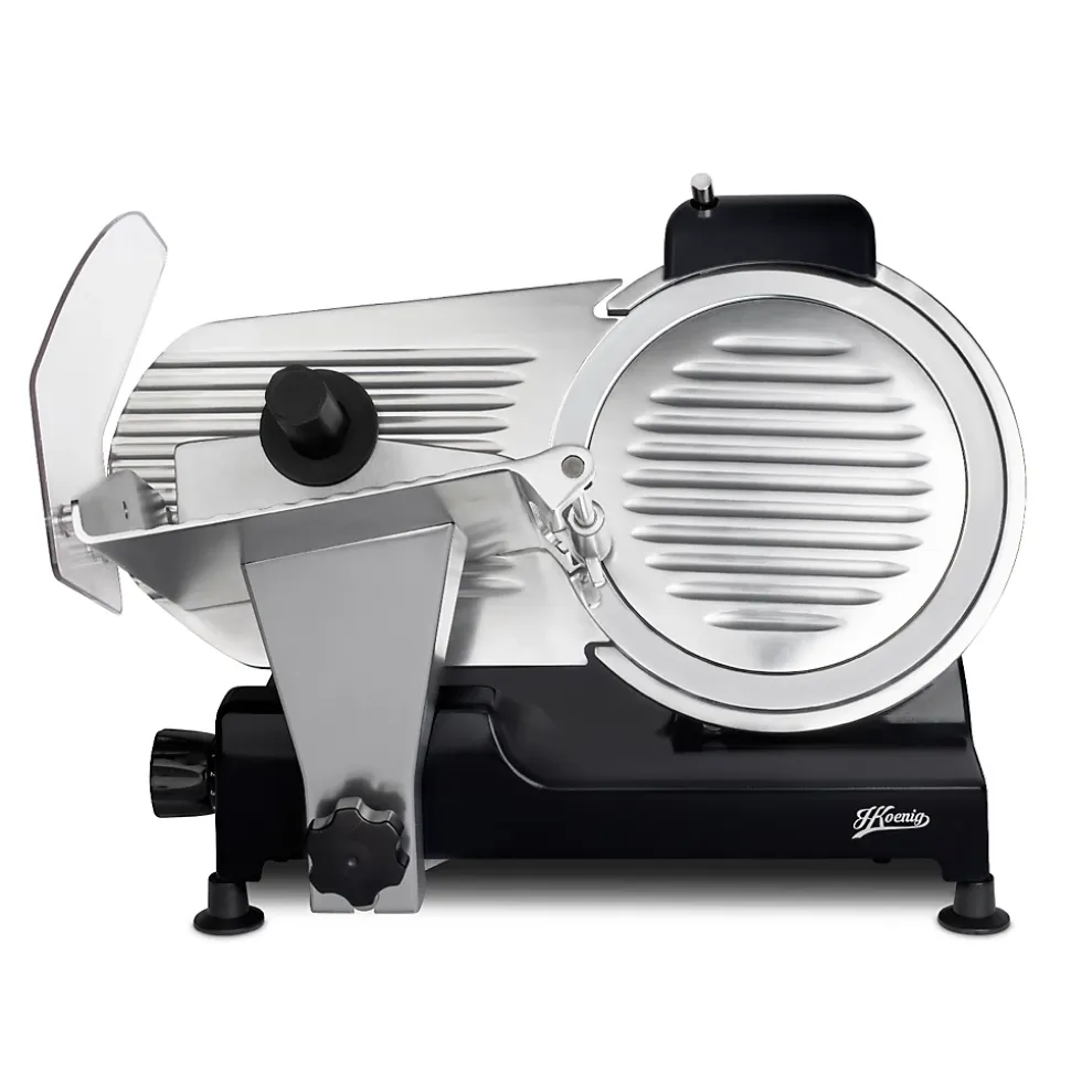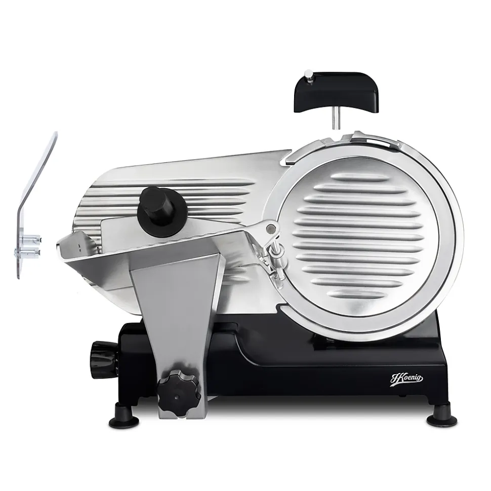 Trancheuse électrique MSX252 H KœNIG — lame 250 mm, moteur asynchrone 240 W (282 tr/min), coupe réglable 0–12 mm, aiguiseur intégré, bras articulé en aluminium, large plateau et 4 pieds antidérapants. Dimensions : 51 x 42 x 39 cm. Poids : 14 kg.