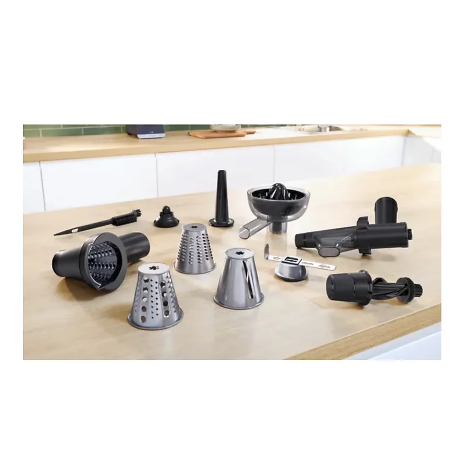 Hachoir à viande Bosch MultiPower Serie 6 MFWS607W : appareil de table compact et performant offrant jusqu’à 3,5 kg/min de débit, moteur 500 W avec pic bloqué 2100 W, boîte planétaire et embrayage métallique pour une longue durée de vie. Deux vitesses + fonction inverse, lame et plaques en acier inoxydable (8 mm inclus), embouts saucisse et kebbé, rangement intégré et accessoires compatibles lave-vaisselle. Conception stable avec pieds ventouse et nettoyage simplifié.