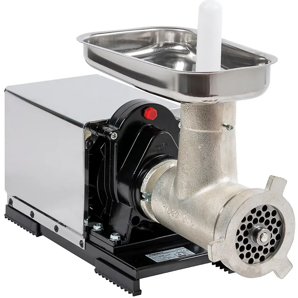 Le hachoir à viande N°32 Reber est destinée aux professionnels (boucheries, charcuteries, traiteurs) souhaitant du matériel qualitatif et résistant pour la réalisation de leurs hachis ou de leurs farces. Il permet également de répondre aux besoins des éleveurs dans le cadre de la transformation de la viande à la ferme. Production à l’heure entre 100 et 160 kg. Nettoyage facile et rapide. Fabrication italienne. Tous les produits sont testés chez le fabriquant. Ce hachoir est livré avec une grille percée de trous de Ø 10 mm. D’autres grilles sont disponibles en option (4.5 mm, 6 mm, 8 mm, 12 mm). Le hachoir à viande N°32 Reber se compose des éléments suivants : Moteur à induction à fonctionnement continu Réducteur à bain d’huile, huile de type Long Life, conforme au contact avec les aliments. Carénage en acier inoxydable AISI 430 Corps, hélice, écrou en fonte étamée certifiée alimentaire Plaque supérieure en acier inox AISI 304 Interrupteur d’inversion d’impulsions Tôle en acier et couteau en acier C55 en standard Caractéristiques : Puissance du moteur : 1200W Dimensions : 58 x 25,5 cm Hauteur : 36 cm Poids 29,3 kg Production horaire : 100-160 kg Indiqué aussi pour faire des saucisses Conseils d’utilisation : Il est impératif de sécher de suite les éléments après nettoyage pour ne pas avoir de traces de rouilles sur la fonte. Nous préconisons de sécher l’entonnoir avec un sèche-cheveux. De plus, pour prolonger la durabilité de vos couteaux, nous suggérons de graisser régulièrement les pivots à l’huile (huile de tournesol) et surtout de ne pas nettoyer les nettoyer avec des détergents agressifs. Nécessite un entretien de l’huile ou un remplacement/remplissage tous les 3