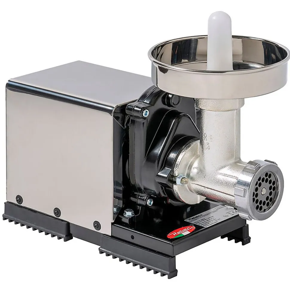 Le hachoir à viande N°5 Reber est destiné aux particuliers et aux semi-professionnels souhaitant du matériel de qualité pour la réalisation de leur hachis ou de leurs farces maison. Il permet également de répondre aux besoins des éleveurs dans le cadre de la transformation de la viande à la ferme. Production à l’heure entre 30 et 50 kg. Nettoyage facile et rapide. Ce hachoir est livré avec une grille percée de trous de Ø 6mm. D’autres grilles sont disponibles en option (4.5 mm, 8 mm, 10 mm, 12 mm). Le hachoir à viande N°5 Reber se compose des éléments suivants : Moteur à induction à fonctionnement continu Réducteur à bain d’huile, huile de type Long Life, conforme au contact avec les aliments. Carénage en acier inoxydable AISI 430 Corps, hélice, écrou en fonte étamée certifiée alimentaire Plaque supérieure en acier inox AISI 304 Tôle en acier et couteau en acier C55 en standard ; Interrupteur Caractéristiques : Puissance du moteur : 400 W Dimensions : 35*17 cm Hauteur : 26,5 cm Poids : 9 kg Production horaire : 30/50 kg Couteau en acier C55 en standard Conseils d’utilisation : Il est impératif de sécher de suite les éléments après nettoyage pour ne pas avoir de traces de rouilles sur la fonte. Nous préconisons de sécher l’entonnoir avec un sèche-cheveux. De plus, pour prolonger la durabilité de vos couteaux, nous suggérons de graisser régulièrement les pivots à l’huile (huile de tournesol) et surtout de ne pas nettoyer avec des détergents agressifs. Nécessite un entretien de l’huile ou un remplacement/remplissage tous les 3 ans. Fabrication italienne. Tous nos produits sont testés chez le fabricant.Garantie 2 ans. Plusieurs