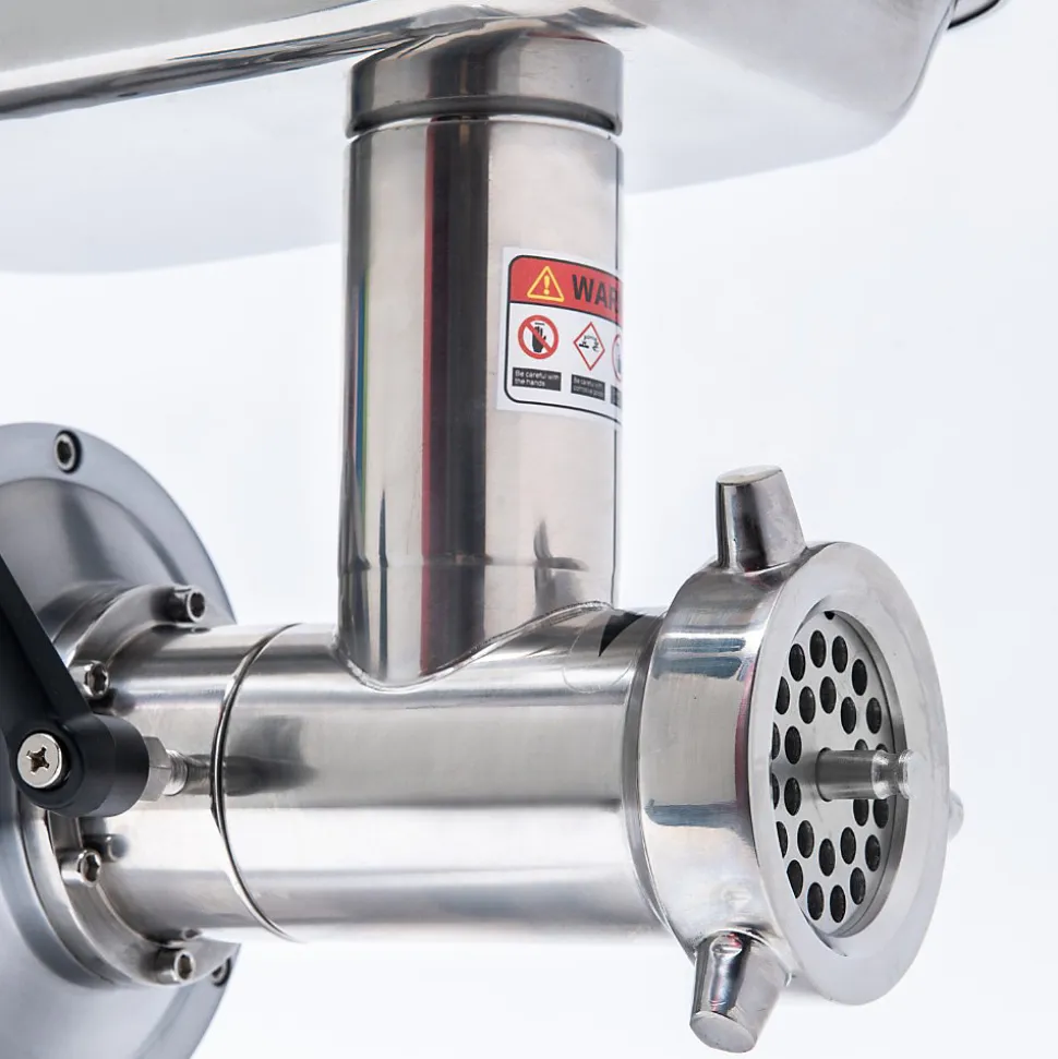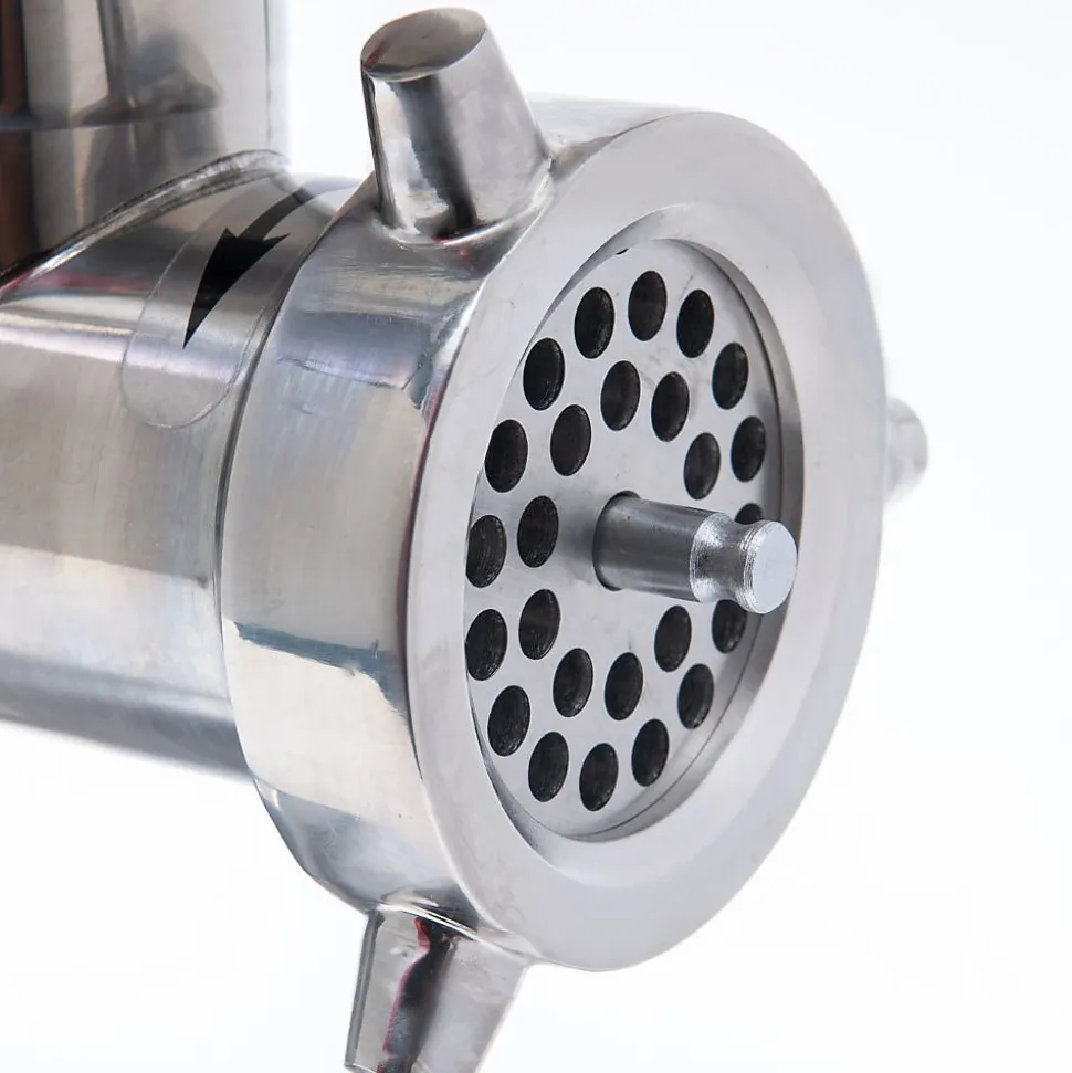 Le hachoir à viande N12 est le modèle idéal pour les professionnels recherchant un appareil fiable, robuste et facile à utiliser dans un format compact. Sa transmission par engrenage entièrement fermée garantit un fonctionnement régulier et un entretien minimal. Équipé d’accessoires en acier inoxydable amovibles, il assure une hygiène parfaite et un nettoyage simplifié.Sa tête amovible et sa poignée latérale facilitent la manutention, tandis que son design soigné sans interstices empêche toute accumulation de résidus. Grâce à son bouton unique avec fonction inversion, son utilisation est intuitive et accessible à tous. Offrant un excellent rapport qualité-prix, il se positionne comme un outil indispensable pour les besoins de hachage réguliers. Caractéristiques : Puissance : 650 W Production horaire : 150 kg/h Dimensions L × l × H : 43,8 × 21 × 38,7 cm Poids : 19,5 kg Grille : trous de 8 mm Matériaux : corps en aluminium, plateau et tête en inox Conforme aux normes alimentaires