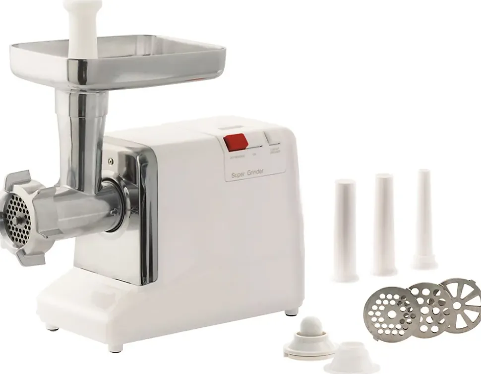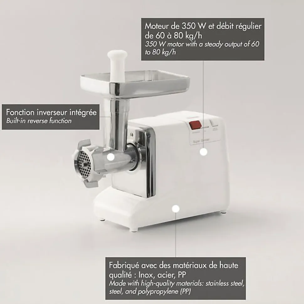 Hachoir électrique Hachoir électrique professionnel doté d’un moteur puissant de 350 W avec fonction inverseur pour débloquer la viande et prolonger la durabilité. Il offre un débit de 60 à 80 kg/h, adapté à un usage intensif. Livré avec 3 grilles (fine, moyenne, grosse) et 3 entonnoirs, il permet de préparer viandes, saucisses, pâtés et farces. Conception robuste avec matériaux de qualité, facile à monter et à nettoyer.Ne pas laver au lave-vaisselle.