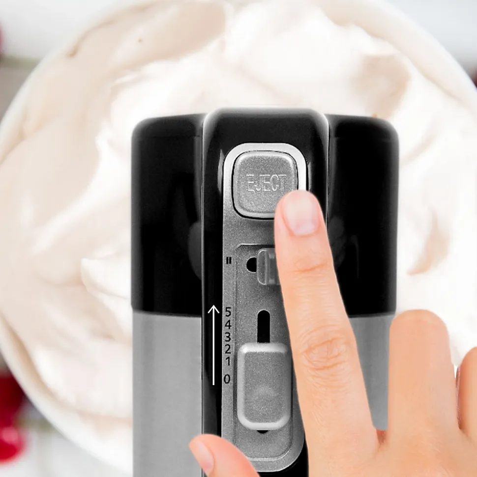 Le batteur à main HM3 de Duronic est un outil de cuisine indispensable pour tout amoureux de cuisine et de pâtisserie. Légèreté et ergonomie ont été mises en avant pour jouir d’un appareil puissant de 300W.L’appareil est livré avec tous les accessoires traditionnels, tels que deux crochets à pétrir et deux batteurs. Facilement démontable grâce à la touche dédiée, ils resteront également parfaitement en place en fonctionnement. Ces accessoires permettent de pétrir de la pâte, battre des œufs en neige, mélanger votre pâte à crêpes ou tout autre recette favorite nécessitant un mélange homogène.Ce batteur à main bénéficie d’un moteur de 300W qui fournit toute la puissance nécessaire par le biais des 5 vitesses disponibles et de la fonction turbo. Cette puissance garantit des performances inégalées en toutes circonstances et la réalisation sans effort de recettes simples ou complexes. Accessoire indispensable pour préparer vos gâteaux et autres pâtisseries, cet appareil est garanti sans BPA.Compact et facile à ranger, l’appareil ainsi que ses accessoires peuvent être placé sur le socle fourni pour prendre un minimum de place lors de son stockage et éviter ainsi de perdre des accessoires. Les accessoires ainsi que la base du batteur sont en acier inoxydable pour garantir leur durabilité.