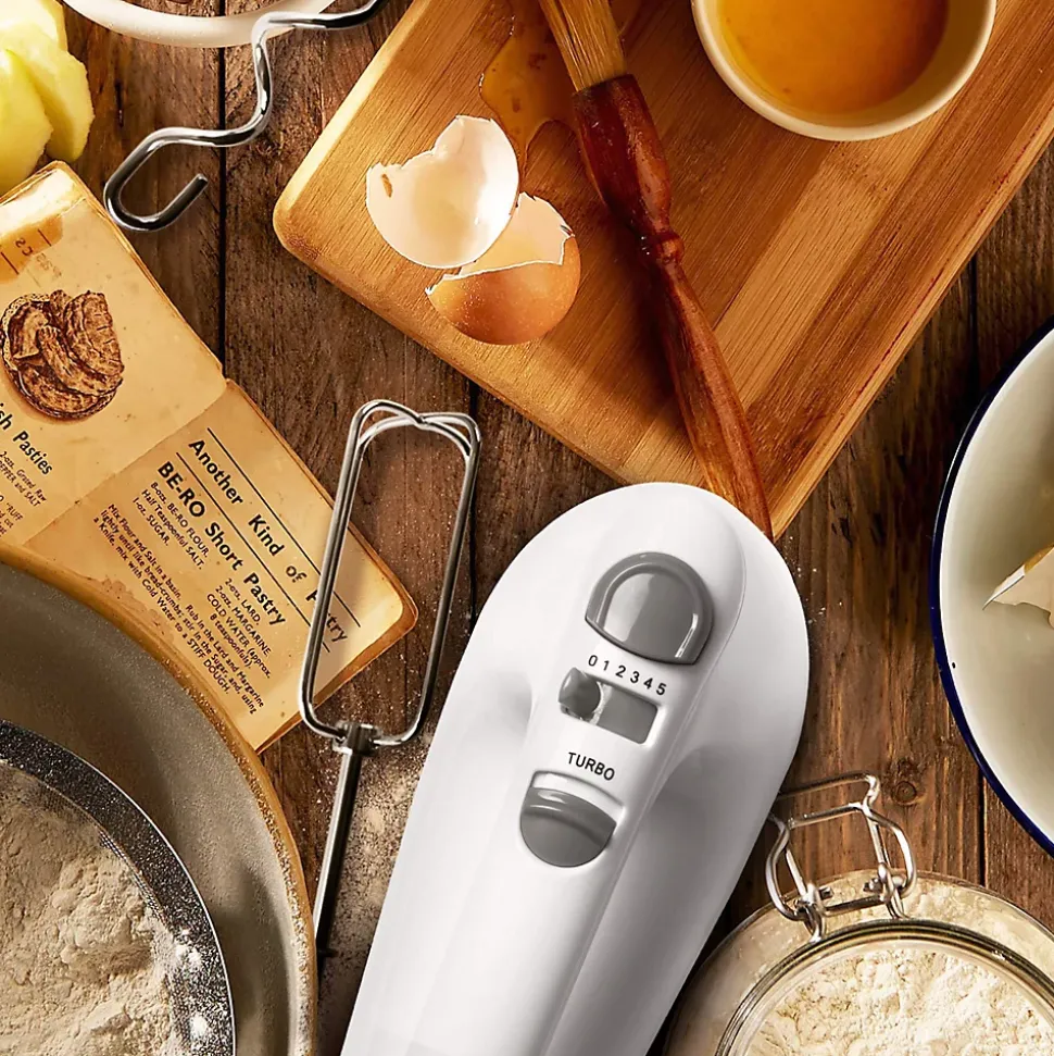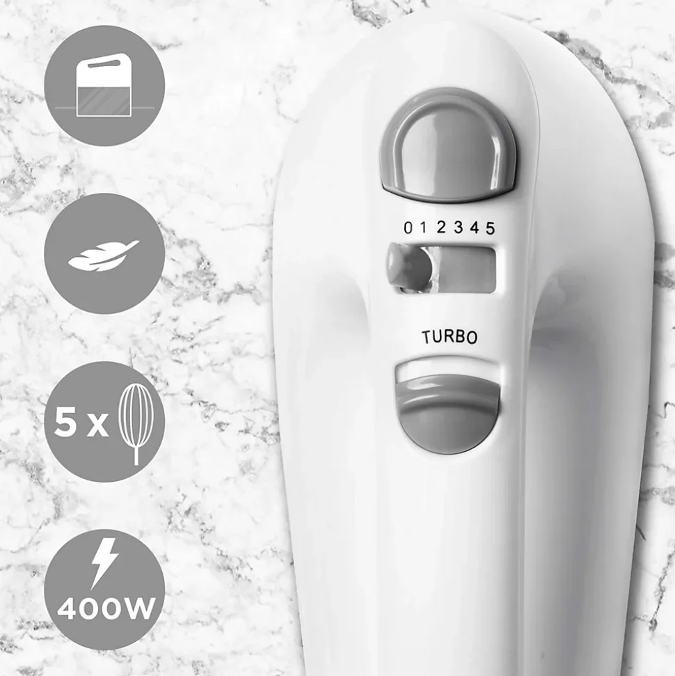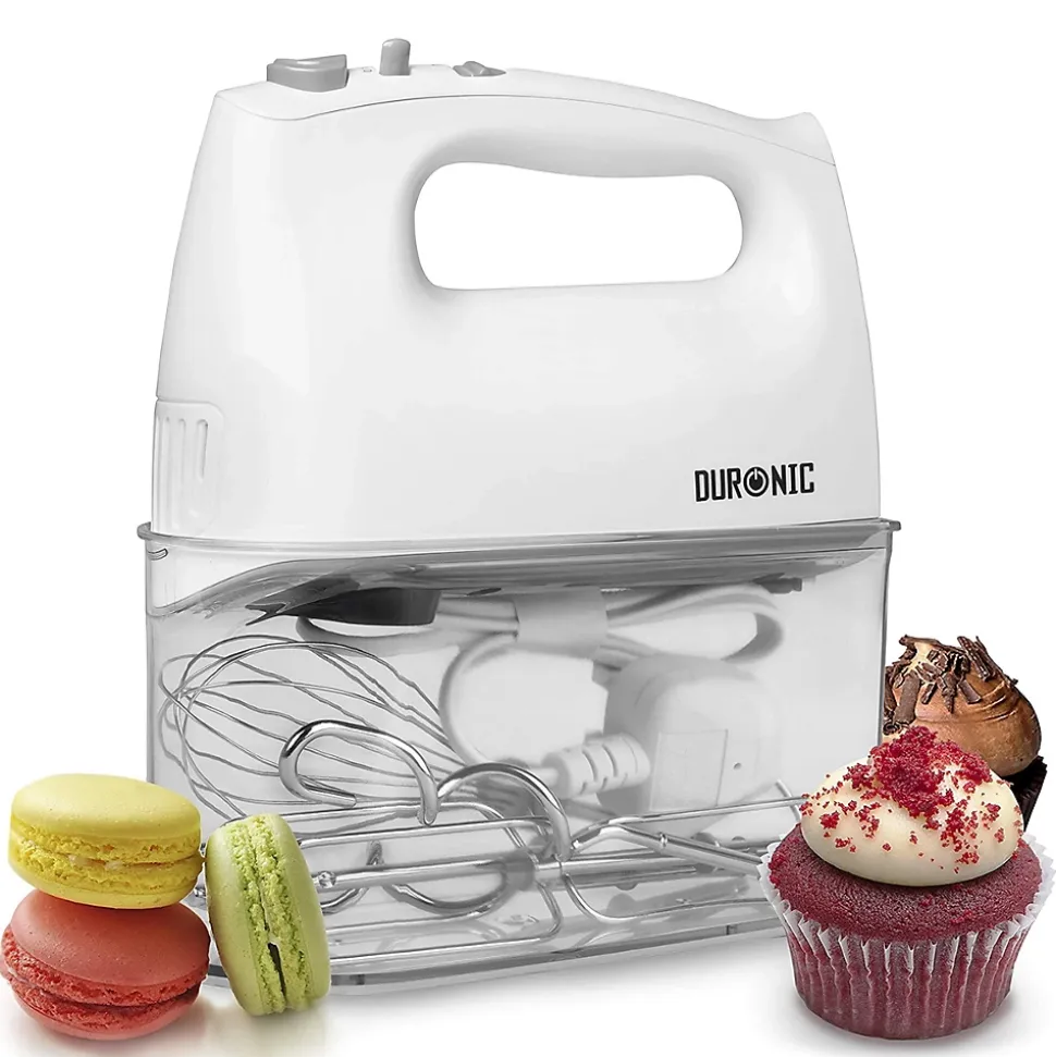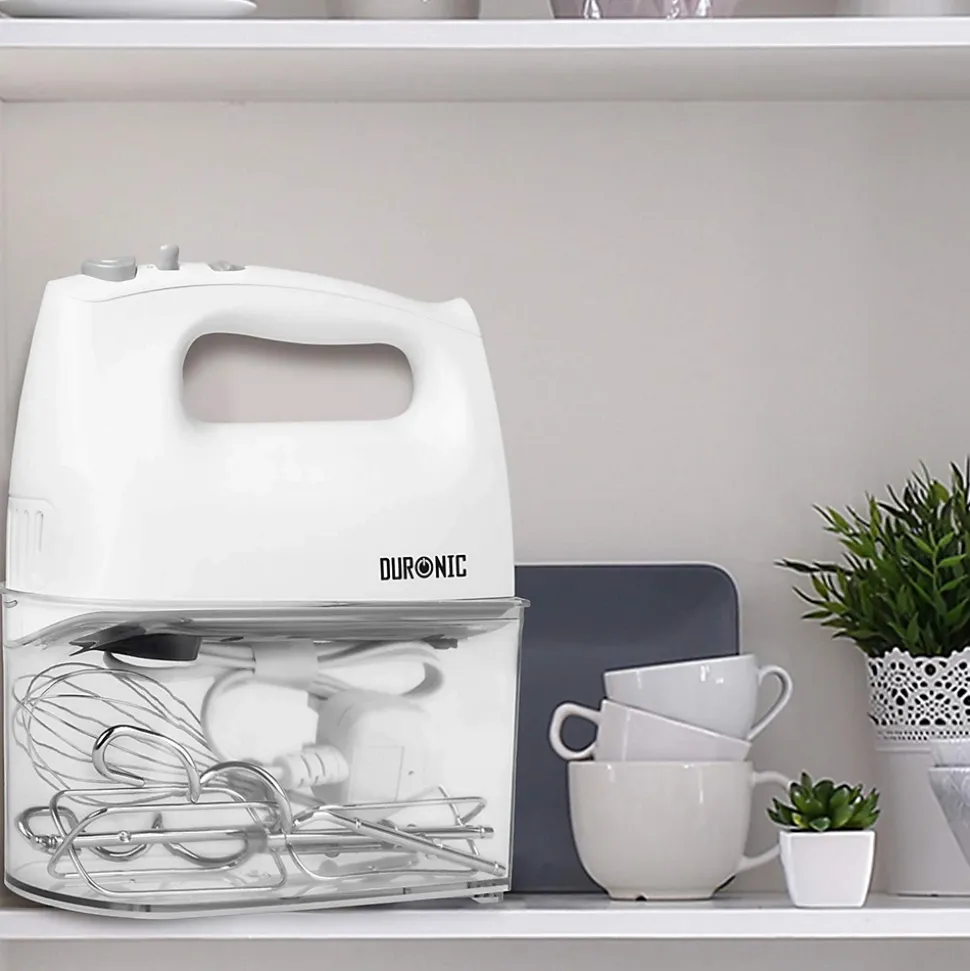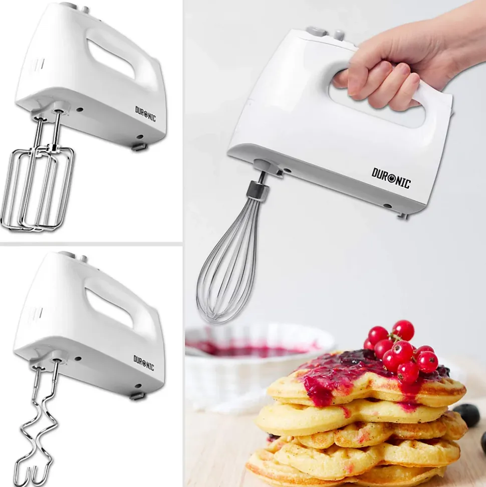 Le batteur à main électrique HM4 de Duronic est un outil de cuisine indispensable pour tout amoureux de cuisine et de pâtisserie. Légèreté et ergonomie ont été mises en avant pour jouir d’un appareil puissant et complet. Un compartiment à accessoires qui s’intègre parfaitement avec l’unité a également été fourni pour ne plus perdre les accessoires nécessaires.L’appareil est livré avec tous les accessoires traditionnels, tels que deux crochets à pétrir, deux batteurs et un fouet. Facilement démontable grâce à la touche dédiée, ils resteront également parfaitement en place en fonctionnement. Ces accessoires permettent de pétrir de la pâte, battre des œufs en neige, ou mélanger votre recette favorite.Le compartiment à accessoires fourni permet de ne plus perdre ces accessoires indispensables au bon fonctionnement. Tous les accessoires rentrent soigneusement dans le compartiment qui se fixe sur le batteur pour plus de convivialité lors de son rangement. Produit à partir d’un plastic renforcé, l’espace disponible permet en outre d’ajouter d’éventuels accessoires supplémentaires que vous souhaiteriez garder en sûreté.Ce batteur bénéficie d’un moteur de 400W qui fournit toute la puissance nécessaire par le biais des 5 vitesses disponibles pour garantir des performances inégalées en toute circonstance.