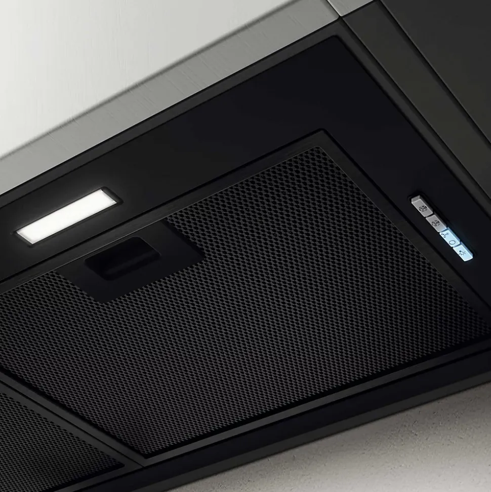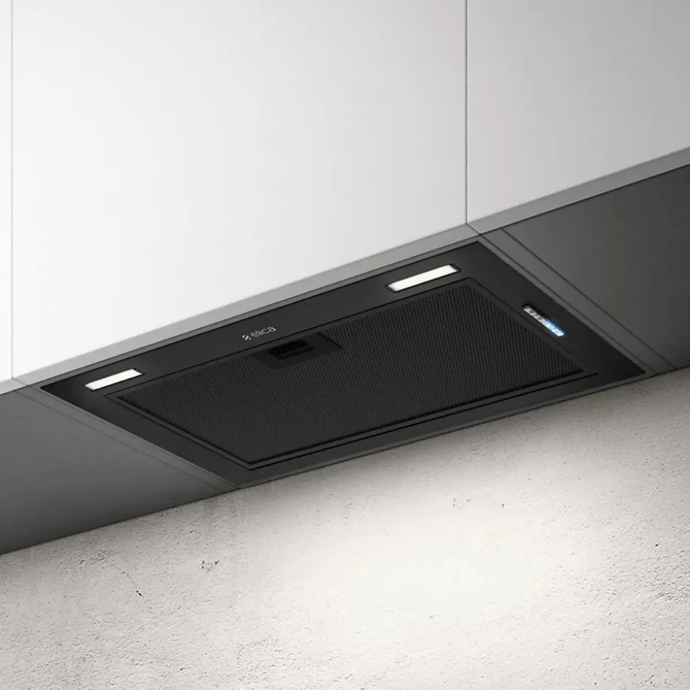 POINTS FORTS : • Hotte aspirante avec extraction, Classe B •• Débit d’air max 580 (m³/h)•• Niveau sonore max 65 (db) •• Largeur 51,4cm (pour meuble haut 60cm min) CARACTÉRISTIQUES : • Commande : Tactile • Eclairage : LED 2 x 2,1 W – 3500 K • Finition : noir mat • SAV : 2 ans – SAV en France – Pièces, main d’oeuvre et déplacement • Marque : Elica • Coloris : Noir • Classe énergétique : B • Sortie d’air (mm) : 120 • Hauteur (mm) : 251 • Profondeur (mm) : 283 • Largeur (mm) : 514 • Matière : Inox • Forme de la hotte : encastrée • Type d’aspiration : extraction • Débit d’air min (m3/h) : 225 • Débit d’air max (m3/h) : 580 • Puissance (w) : 180 • Niveau sonore min (dB) : 46 • Niveau sonore max (dB) : 65 • Bon à savoir : La hotte est vendue en version aspirante avec extraction. Cependant, vous pouvez aussi l’installer en version recyclage en commandant 2 filtres à charbon. Référence filtre : CHACC115 (ean 3663019048240) • Poids net (kg) : 7.5