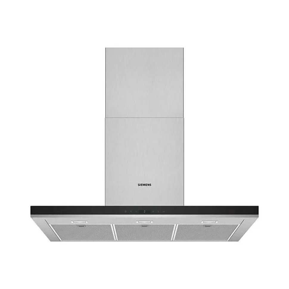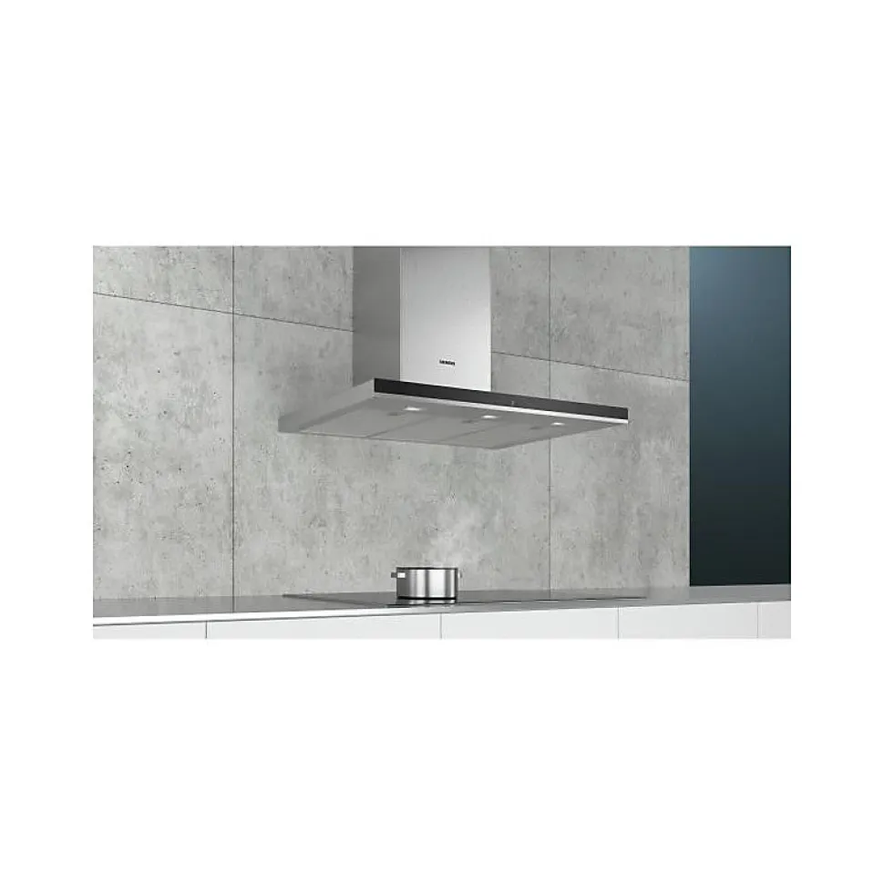 Hotte décorative murale Siemens LC97BHP50 en acier inox de 90 cm, équipée de 5 vitesses dont 2 intensives temporisées, technologie iQdrive, commandes tactiles avec affichage digital LED, éclairage LED SoftLight, filtre à graisse en aluminium lavable, possibilité de recyclage avec kit optionnel, volume sonore réduit, design élégant et finition inox et verre.