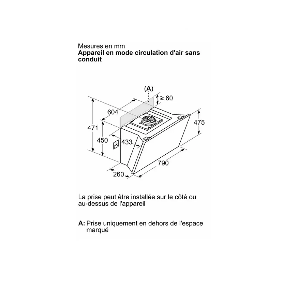 Hotte décorative inclinée 80cm 432m3/h noir Bosch – Hotte décorative inclinée Série 6 Bosch DWK81AN60 avec finition en verre. Plus pratique et plus ergonomique : contrôlez votre hotte à partir de la table de cuisson. Home Connect : des hottes connectées qui vous facilitent la vie. Technologie EcoSilence Drive™ : pour des hottes alliant puissance et économie d’énergie. Eclairage LED à faible consommation qui fournit une lumière blanche idéale pour votre zone de cuisson. Vitesse intensive : élimine efficacement et rapidement les odeurs. – Type de produit : Hotte décorative inclinée.Type de montage : Mural.Mode d’aspiration : Recylage ou évacuation.Puissance totale des moteurs : 190 W.Système de commandes : LED, touchControl.Nombre de vitesses : 3 vitesses + 1 intensif.Débit d’aspiration max. en évacuation : 432 m³/h.Débit d’air position intensive en évacuation : 915 m³/h.Puissance acoustique à vitesse max. (2010/30/EC) : 51 dB.Amplification de la puissance acoustique (2010/30/CE : 68 dB.Débit d’aspiration max. en recyclage : 438 m³/h.Débit de l’aspiration en Recyclage d’air position turbo : 886 m³/h.Niveau sonore max. (recirculation) : 60 dB.Niveau sonore boost (recirculation) : 78 dB.Matériau du filtre à graisses : Inox résistant au lave-vaisselle.Classe d’efficacité énergétique : A+.Consommation d’énergie : 35,5 kWh/a.PerfectAir – Adapte automatiquement l’aspiration aux fumées : Non.Contrôle de la hotte via la table de cuisson : Oui.EcoSilence Drive – Moteur économe et silencieux : Oui.Extra silencieux : Oui.Position intensive : Oui.Mode d’arrêt différé : 10 min.Nombre de lampes : 2.Luminance totale : 422 lux.Color temperature : Neutral (3.500 K).Eclairage SoftLight : Oui.Contrôle de la couleur de l’éclairage avec l’app Home Connect : Oui.EmotionLight Pro : halo de lumière autour de votre hotte : Non.Home Connect –