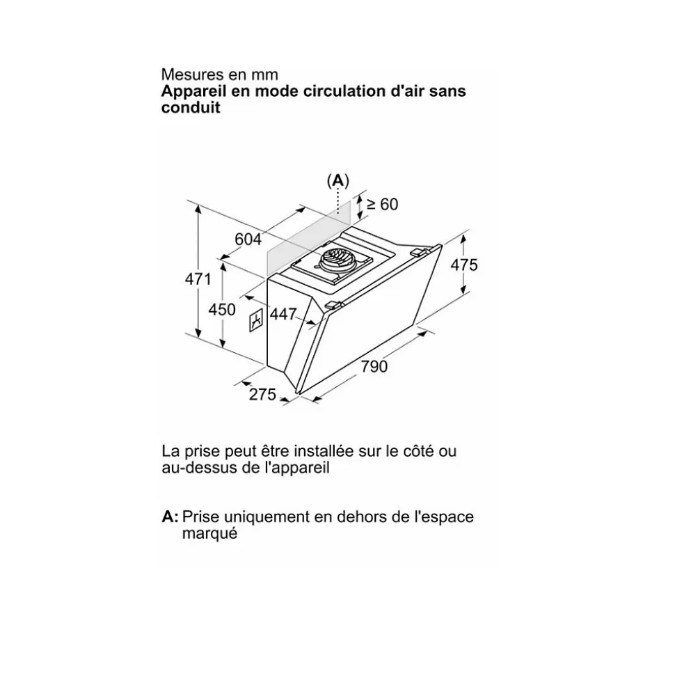 Hotte décorative inclinée 80cm 432m3/h noir Siemens – Hotte décorative inclinée iQ500 Siemens LC81KAN60 avec finition en verre. Moteur iQdrive : performant et agréablement silencieux. Puissant et silencieux : le moteur iQdrive. cookConnect system : Contrôlez la puissance et l’éclairage de votre hotte depuis votre table de cuisson. Commande vocale : réglez la puissance et l’éclairage de votre hotte à la voix. Home Connect : l’application qui rend votre hotte intelligente. – Type de produit : Hotte décorative inclinée.Type de montage : Mural.Mode d’aspiration : Recylage ou évacuation.Puissance totale des moteurs : 190 W.Système de commandes : LED, touchControl.Nombre de vitesses : 3 vitesses + 1 intensif.Débit d’aspiration max. en évacuation : 432 m³/h.Débit d’air position intensive en évacuation : 915 m³/h.Puissance acoustique à vitesse max. (2010/30/EC) : 51 dB.Amplification de la puissance acoustique (2010/30/CE : 68 dB.Débit d’aspiration max. en recyclage : 438 m³/h.Débit de l’aspiration en Recyclage d’air position turbo : 886 m³/h.Niveau sonore max. (recirculation) : 60 dB.Niveau sonore boost (recirculation) : 78 dB.Matériau du filtre à graisses : Inox résistant au lave-vaisselle.Classe d’efficacité énergétique : A+.Consommation d’énergie : 35,5 kWh/a.ClimateControl – les capteurs intelligents adaptent l’aspiration : Non.CookConnect – Contrôle de la hotte depuis la plaque : Oui.Moteur iQdrive : Oui.Extra silencieux : Oui.Position intensive : Oui.Mode d’arrêt différé : 10 min.Nombre de lampes : 2.Luminance totale : 422 lux.Color temperature : Neutral (3.500 K).SoftLight : intensité d’éclairage réglable : Oui.Contrôle de la couleur de l’éclairage avec l’app Home Connect : Oui.EmotionLight Pro : halo de lumière autour de votre hotte : Non.Home Connect – Commande et diagnostic à distance : Oui.Caractéristiques Home