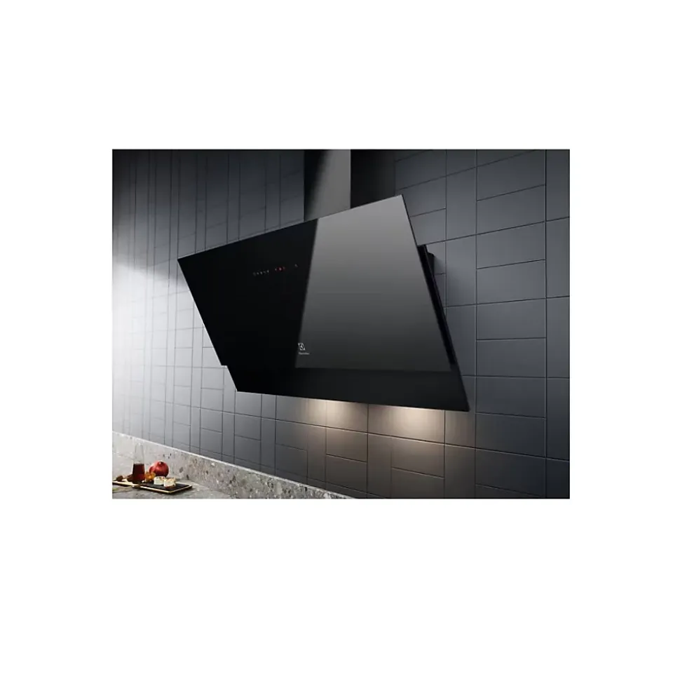 Hotte décorative inclinée 90cm 460m3/h noir Electrolux – Hotte décorative inclinée Série 700 Electrolux LFV429K. Laissez votre table s’occuper de votre hotte. La hotte série 700 avec fonction Hob2Hood contrôle automatiquement les réglages de la hotte. Pendant que vous cuisinez, le ventilateur s’ajuste en fonction des changements de température que vous effectuez ou si vous commencez à utiliser plus d’une zone. Vous pouvez donc vous concentrer davantage sur la création de plats. Son moteur de hotte puissant et perfectionné garantit que votre cuisine reste exempte de fumées et d’odeurs de cuisson indésirables. Il purifie l’air rapidement et efficacement. Profitez d’un éclairage de qualité pendant que vous cuisinez. Nos lampes LED consomment beaucoup moins d’énergie que les autres lampes et offrent une excellente visibilité dans la cuisine, ce qui vous permet de cuisiner en toute tranquillité. Notre filtre à graisse fiable vous permet de toujours profiter d’un espace de cuisson plus sain. Lorsque vous avez besoin d’un nouveau filtre, il peut être facilement lavé ou remplacé. Votre cuisine reste plus propre, plus longtemps. – Type de produit : Hotte décorative inclinée.Gamme : Série 700.Type : Hotte murale inclinée.Mode de fonctionnement : Evacuation ou recyclage.Moteur intégré : Oui.Hotte connectée : Oui.Type de connectivité : Connexion H²H (hotte pilotée par la table).Type de commandes : Sensitives.Nbre de vitesse(s) : 4.Vitesse intensive : Oui.Type d’éclairage : LED 5.7 W.Consommation d’énergie annuelle (AEC hotte) en kWh/an : 103.8.Classe d’efficacité énergétique : C.Efficacité fluidodynamique (FDE hotte) : 17.2.Classe d’efficacité fluidodynamique : D.Efficacité lumineuse (LE hotte) en lux/watt : 33.3.Classe d’efficacité lumineuse : A.Efficacité de filtration des graisses (%) : 45.1.Classe d’efficacité de filtration des graisses : F.Débit d’air (en m3/h) à la vitesse