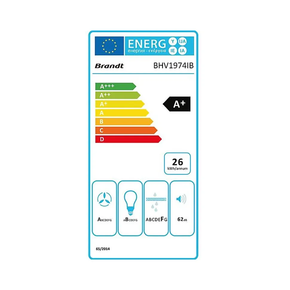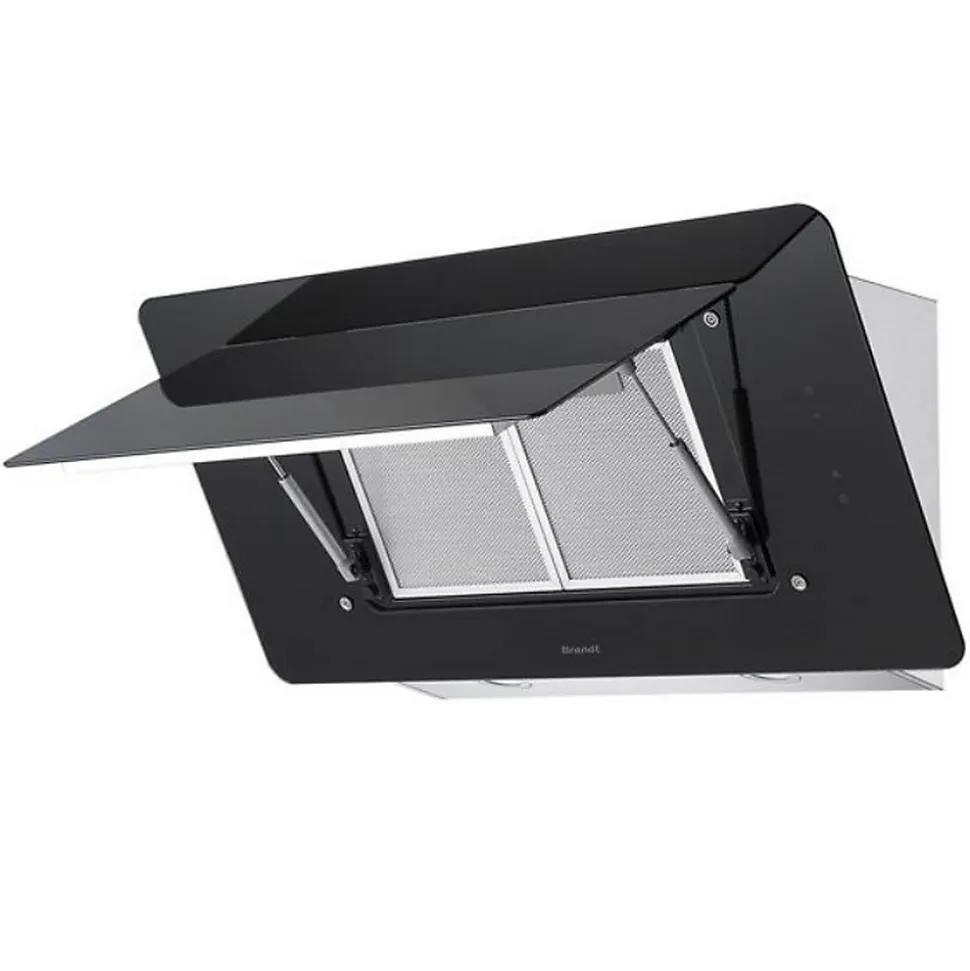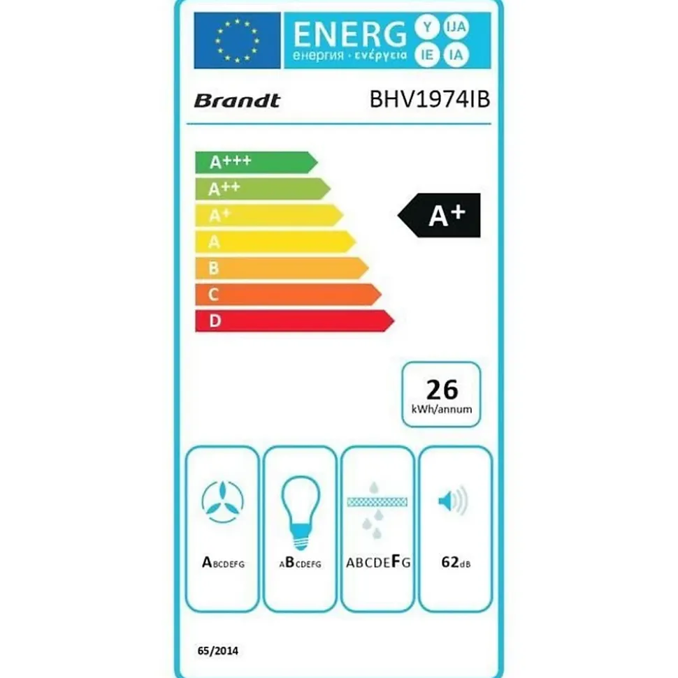 Hotte décorative inclinée 90cm 543m3/h inox/verre Brandt – Hotte décorative inclinée Brandt BHV1974IB avec Aspiration périphérique : La structure originale de votre hotte cache les filtres à graisse tout en conservant son efficacité. Commandes électroniques sensitives : Le réglage du débit ou de l’éclairage se fait par un simple effleurement du doigt sur le bandeau sensitif en verre. Le confort est garanti et la pureté des lignes préservée. Eclairage par LED : Afin de garantir une faible consommation électrique et un parfait éclairage ce modèle est équipé d’un éclairage par LED. Evacuation en option : pour cela, commandez le kit cheminée référence ATC-252X avec adaptateur sortie moteur. – Type de produit : Hotte décorative murale.Débit : 543 m3/h.Niveau sonore : 62 dB.Conso élec : 26 kWh / an.Connecté : non.Eco Label énergie : A+.Evacuation des vapeurs : A.Efficacité éclairage : A.Filtration des graisses : F.Le + produit : Finition inox et verre noirLargeur 90 cm.3 vitesses.Commandes électroniques sensitives.Aspiration périphérique.Filtre à graisse aluminium lavable.Filtre à charbon fourni (référence CF115).Eclairage LED.Sortie Ø 120/150 mm.Finition inox et verre noir.Type de hotte : incliné.Coloris : inox et verre.Cordon électrique : NC.Filtre à charbon : fourni.Filtre à charbon : CF115.Diamètre de la sortie d’air : 120 / 150 mm.Dimensions : L 90 x H 39 x P 39,4 (haut) cm.Poids net : 19 Kg.