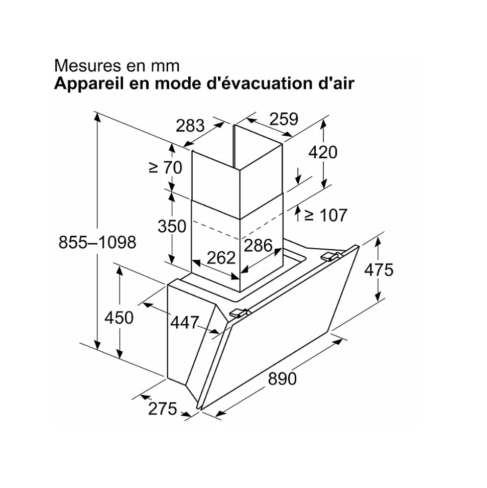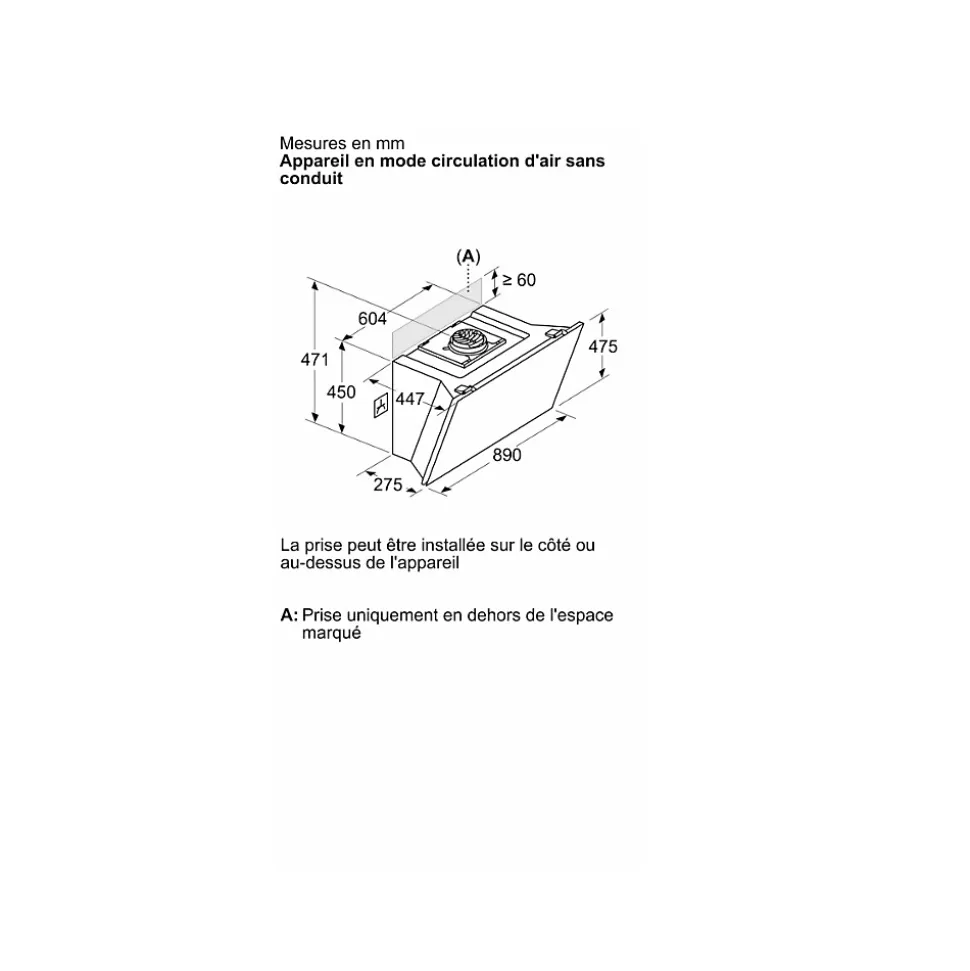 Hotte décorative murale 90cm 51db 441m3/h noir Bosch – La hotte inclinée DWK91LT60 Bosch la plus silencieuse d’Europe avec moteur Eco Silence DriveTM et capteur PerfectAir pour une cuisine parfaite, sans odeurs et sans bruit. Facilité de nettoyage : vis et câbles cachés, arrêtes arrondies pour un nettoyage facile. Plus pratique et plus ergonomique : contrôlez votre hotte à partir de la table de cuisson. Home Connect : des hottes connectées qui vous facilitent la vie. Technologie EcoSilence Drive™ : pour des hottes alliant puissance et économie d’énergie. Eclairage LED à faible consommation qui fournit une lumière blanche idéale pour votre zone de cuisson. – Type de produit : Hotte inclinée.Type de montage : Mural.Typologie : Wall-mounted.Type de commandes : Electronique.Classe d’efficacité énergétique A+* sur une échelle allant de A+++ à D.Consommation énergétique moyenne : 39.1 kWh/an*.Classe d’efficacité ventilateur : A*.Classe d’efficacité éclairage : A*.Classe d’efficacité filtre à graisse : C*.Température de couleur : 3500 K.Niveau sonore : 51 dB(A) re 1 pW.Diamètre du réducteurd’évacuation d’air : 150 mm.Matériau du filtre à graisses : Inox résistant au lave-vaisselle.Puissance de raccordement : 250 W.Intensité : 10 A.Tension : 220-240 V.Fréquence : 50, 60 Hz.Intensité lumineuse : 422 lux.Câble de raccordement avec prise : 1.3 m.Nombre de vitesses : 3 vitesses + 2 intensif.Vitesse 1 : débit d’extraction228 M3H , niveau sonore 35 DB(A) re1pW.Vitesse 2 : débit d’extraction325 M3H , niveau sonore 43 DB(A) re1pW.Vitesse 3 : débit d’extraction441 M3H , niveau sonore 51 DB(A) re1pW.Intensive 1 : débit d’extraction753 M3H , niveau sonore 65 DB(A) re1pW.Intensive 2 : débit d’extraction1007 M3H, niveau sonore 70 DB (A) re1pW.Débit d’aspiration max. en évacuation : 441 m³/h.Débit de l’aspiration en Recyclage d’air position turbo : 944