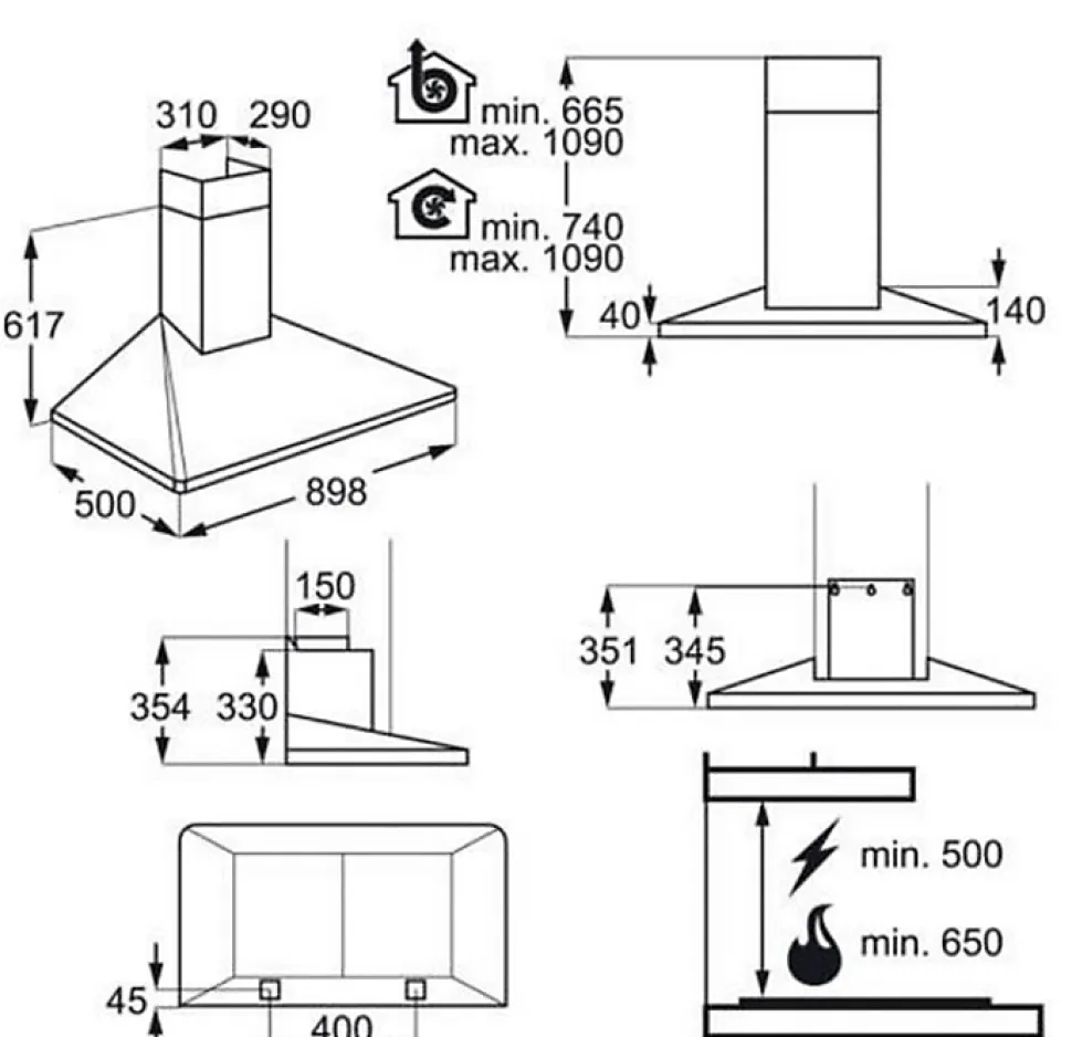 Clapet anti-retour : OuiClasse d’efficacité de filtration des graisses : DClasse d’efficacité énergétique : AClasse d’efficacité fluidodynamique : AClasse d’efficacité lumineuse : AConsommation d’énergie annuelle en kWh (AEC) : 42.1Consommation d’énergie en mode arrêt (W) : Non communiqué par le fabricantConsommation d’énergie en mode veille (W) : Non communiqué par le fabricantCouleur : InoxDébit d’air : 603 m3/hDébit d’air max. en évacuation hors intensif (m3/h) : 603Débit d’air min. en évacuation hors intensif (m3/h) : 256Diamètre du réducteur d’évacuation d’air (mm) : 150Efficacité de filtration des graisses (%) : 66Efficacité fluidodynamique (FDE) : 31.4Efficacité lumineuse en lux/watt (LE) : 29Filtre à charbon pour recyclage inclus : OuiHauteur (cm) : 66.5-109Largeur : 89.8 cmLargeur (cm) : 89.8Mode de fonctionnement : Evacuation ou recyclageMoteur intégré : OuiNbre de vitesse(s) : 3Niveau sonore max. : 67 dBNiveau sonore max. en évacuation hors intensif (dB) : 67Niveau sonore min. en évacuation (dB) : 47Poids (kg) : 15.7Profondeur (cm) : 50Puissance de raccordement (W) : 200Puissance moteur (W) : 195Style hotte : Hotte décorativeSystème filtre(s) : 2 filtres aluminium cassetteType : HotteType d’éclairage : LED 2 x 2.5 WType de commandes : MécaniquesType de hotte : DécorativeVitesse intensive : NonVoyant(s) de saturation de(s) filtre(s) : Oui