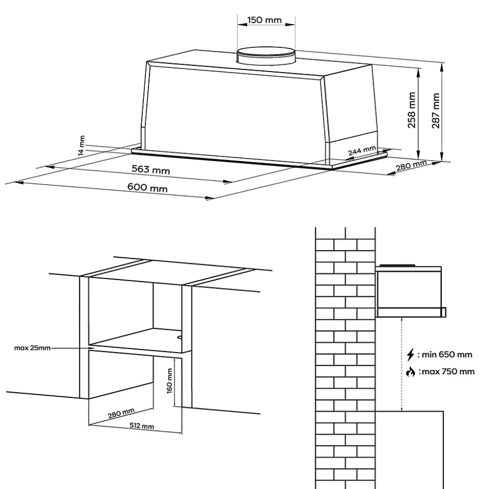 Référence: CD6931BKType produit: hotte aspirante encastrableCouleur: Noir et InoxDébit d’air max.: 450 m³/hClasse énergétique: AConsommation annuelle d’énergie: 20 kWhNiveau sonore max.: 62 dB(A)Commandes: Tactile et gesteMode de fonctionnement: Évacuation ou RecyclageFiltre à charbon: Modèle CBCF055, inclusÉclairage: 1*6W LEDPuissance moteur: 85 W, 220–240 V / 50 HzCourant nominal: 3ADiamètre de sortie d’air: 15 cmDimensions:Largeur: 60 cmProfondeur: 28 cmHauteur: 25,8 cmHauteur requise sur la plaque de cuisson à gaz: 75 cmHauteur requise sur la plaque de cuisson électrique: 65 cmNote: Le conduit d’air à évacuer vers l’extérieur n’est pas inclus.Conseil d’entretien: Pour garantir des performances optimales, remplacez les filtres à charbon tous les 2 à 4 mois et nettoyez les filtres à graisse toutes les 2 à 3 semaines.Package inclus:1 x Hotte aspirante encastrable1 x Kit d’accessoires de montage2 x Filtre au charbon (1 paire)1 x Mode d’emploi