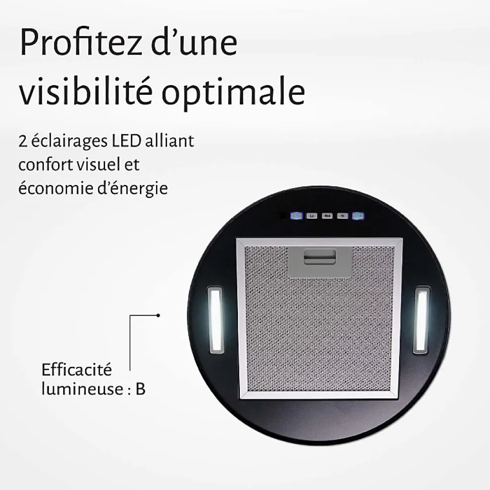 - Hotte à recyclage, équipée d’une télécommande et d’un éclairage puissant. Filtres à graisse en aluminium : lavables en lave-vaisselle.