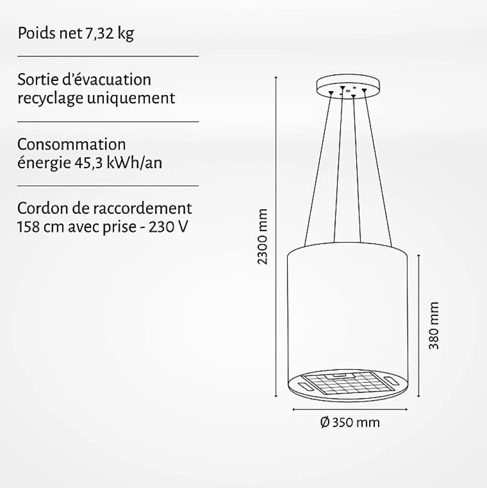 - Dimensions nettes (L x P x H) Hotte : Hauteur 38 cm Diamètre 35 cm / Support de fixation : ⌀ 18 cm – Poids net : 7,32 kg