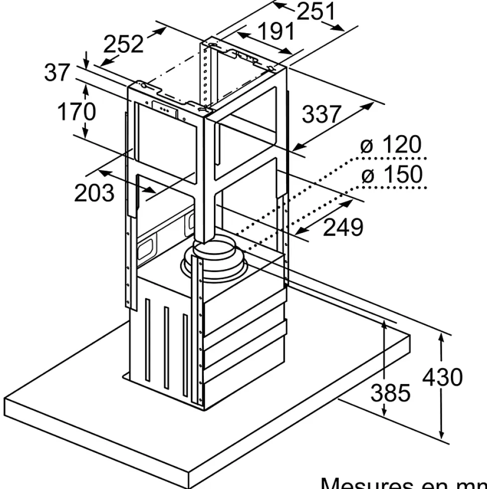 Présentation du ProduitLa hotte îlot BOSCH DIB97IM50 est conçue pour les cuisines modernes et ouvertes, offrant une largeur de 89,8 cm. Elle est fabriquée en acier inoxydable, ce qui lui confère une apparence élégante et robuste. Cette hotte est idéale pour les grandes cuisines, grâce à son débit d’aspiration élevé et à sa capacité à fonctionner en mode évacuation ou recyclage.Caractéristiques TechniquesLa hotte îlot BOSCH DIB97IM50 dispose de trois vitesses d’aspiration ainsi qu’un réglage intensif, permettant une extraction d’air maximale de 438 m³/h et pouvant atteindre 754 m³/h en position turbo. Elle est équipée d’un système de commande électronique tactile pour un usage intuitif. Le niveau sonore est relativement bas, avec une puissance sonore de 57 dB à vitesse maximale, assurant un environnement de cuisine confortable.Conception et ErgonomieConçue pour faciliter le nettoyage, cette hotte îlot présente des vis et câbles cachés ainsi que des arêtes arrondies. Elle est également équipée d’un éclairage LED pour une illumination optimale de la zone de cuisson. La sélection rapide des paramètres via le panneau tactile ajoute à son ergonomie.Avantages et UtilisationLa hotte îlot BOSCH DIB97IM50 est idéale pour les cuisiniers qui recherchent à la fois performance et facilité d’utilisation. Elle est parfaite pour les grandes cuisines où l’air doit être renouvelé rapidement, tout en offrant un design élégant qui s’intègre bien dans n’importe quel décor.