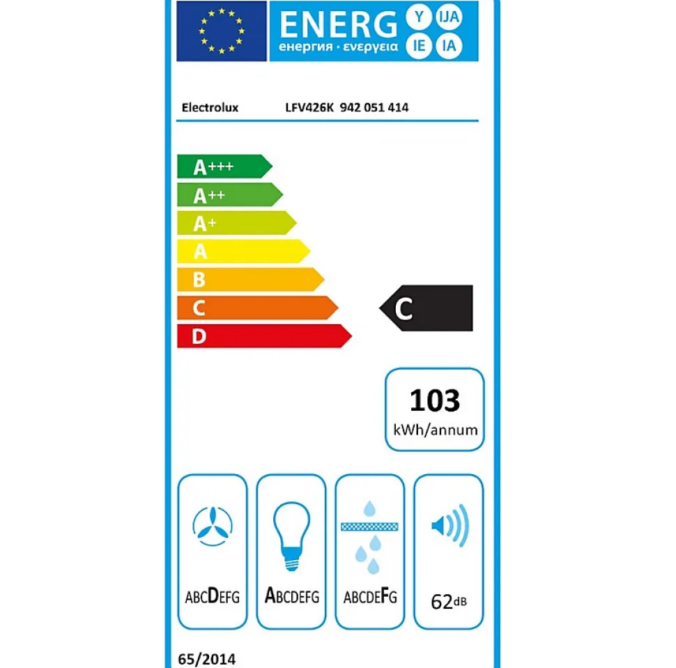 Hotte murale inclinée 60cm 460m3/h noir Electrolux – Hotte murale inclinée Electrolux LFV426K avec visibilité totale sur la zone de cuisson. Grâce à l’éclairage intégré de la hotte 600 LEDSpot, vous pouvez voir clairement comment vos aliments sont cuits sur la plaque de cuisson. Spécialement conçu pour être économe en énergie et durable. Hob2Hood pour un confort absolu : Grâce à la technologie Hob2Hood, commencez la cuisson et la hotte ajuste automatiquement les réglages de celle-ci, offrant la meilleure extraction en fonction de la puissance sélectionnée sur la plaque de cuisson. Réduit de façon fiable les fumées de cuisson : Grâce à l’efficacité de cette hotte aspirante, créez une atmosphère plus saine pour cuisiner. Son moteur fiable réduit efficacement les vapeurs de cuisson et vous permet de profiter pleinement de votre cuisine. Un filtre à graisse standard pour une cuisine saine : Notre filtre à graisse fiable vous permet de toujours profiter d’un espace de cuisson plus sain. Lorsque vous avez besoin d’un nouveau filtre, il peut être facilement lavé ou remplacé. Votre cuisine reste plus propre, plus longtemps. Commandes tactiles sur le verre : Parfaitement intégrées au verre et ce, de manière élégante, les commandes tactiles électroniques vous permettent de gérer en douceur et avec précision les réglages et les modes de fonctionnement de la hotte. – Type de produit : Hotte murale inclinée.Mode de fonctionnement : Evacuation ou recyclage (filtre à charbon inclus).Moteur intégré : Oui.Hotte connectée : Oui.Type de commandes : Sensitives.Nbre de vitesse(s) : 4.Vitesse intensive : Oui.Type d’éclairage : LED 2 x 2.5 W.Le(s) plus-produit(s) : Connexion H²H (hotte pilotée par la table).Couleur : Noir.Classe d’efficacité énergétique : C.Consommation d’énergie annuelle (AEC hotte) en kWh/an : 103.Classe d’efficacité énergétique : C.Efficacité fluidodynamique (FDE hotte) : 17.2.Classe