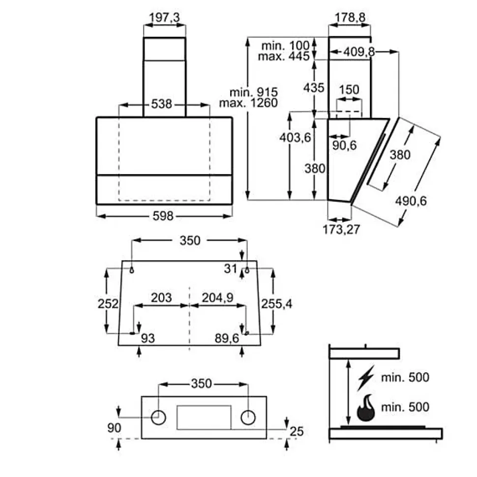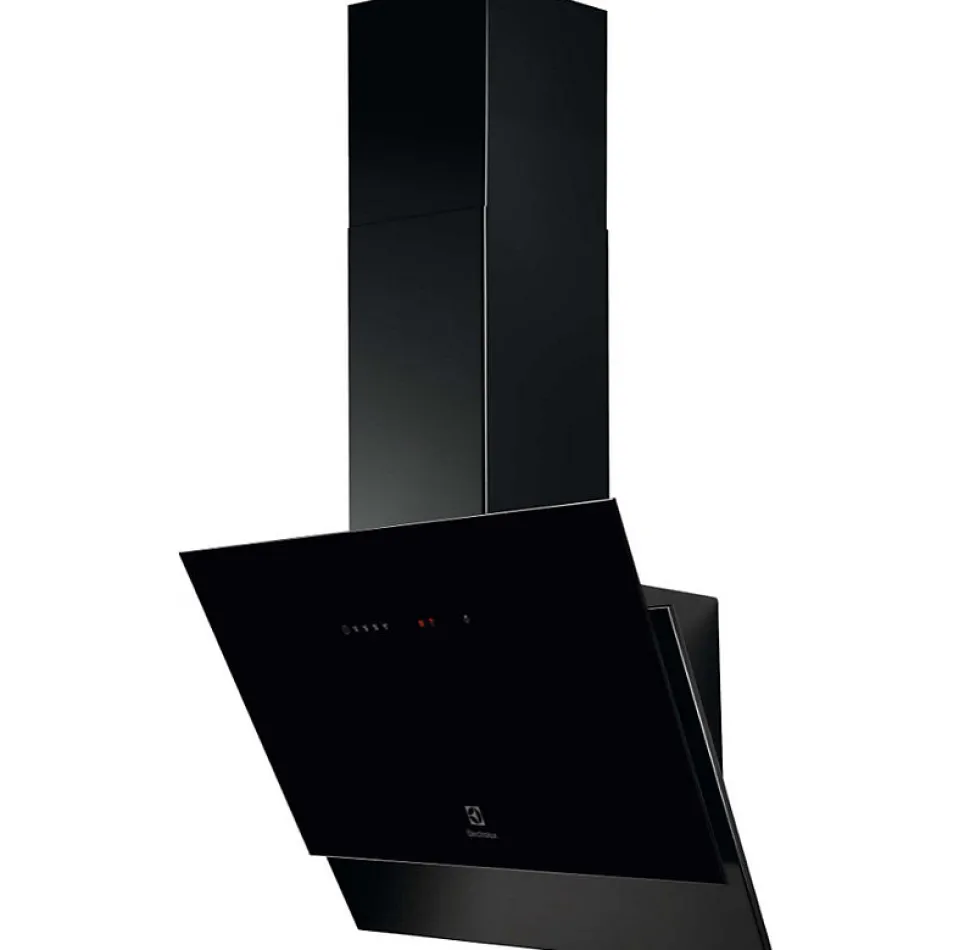 Hotte decorative Electrolux LFV426K noire 60cm, design mural incliné. Puissance d’extraction 600 m³/h, moteur 210W. Filtres aluminium lavables, filtre charbon pour recyclage inclus, indicateur saturation filtres. Eclairage LED classe A. Technologie Hob2Hood pour ajustement automatique. Commandes tactiles sur verre. Clapet anti-retour. Kit fixation inclus.